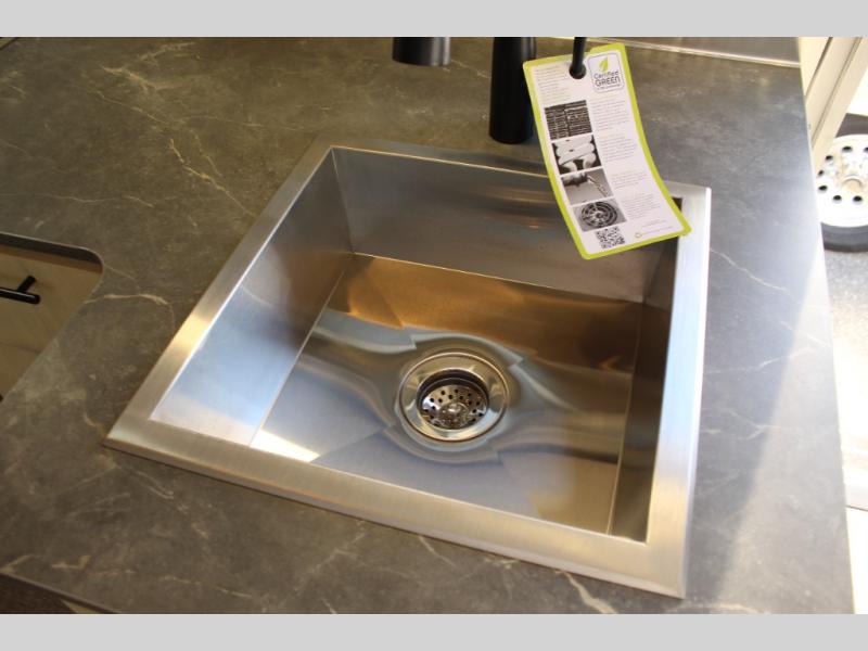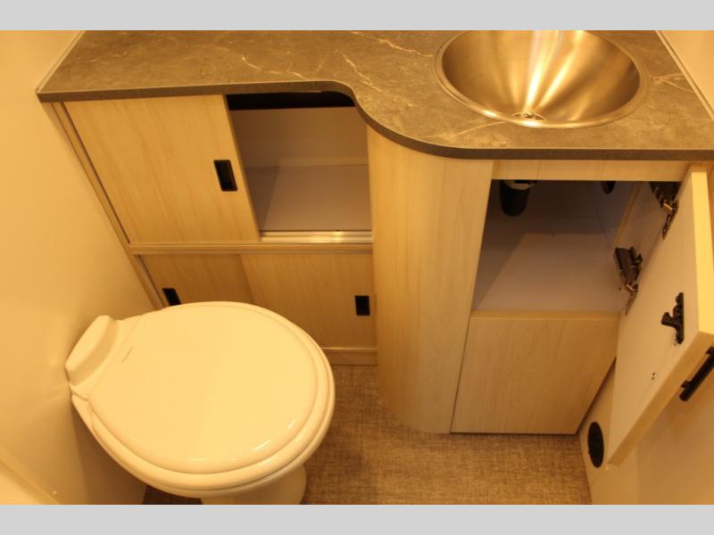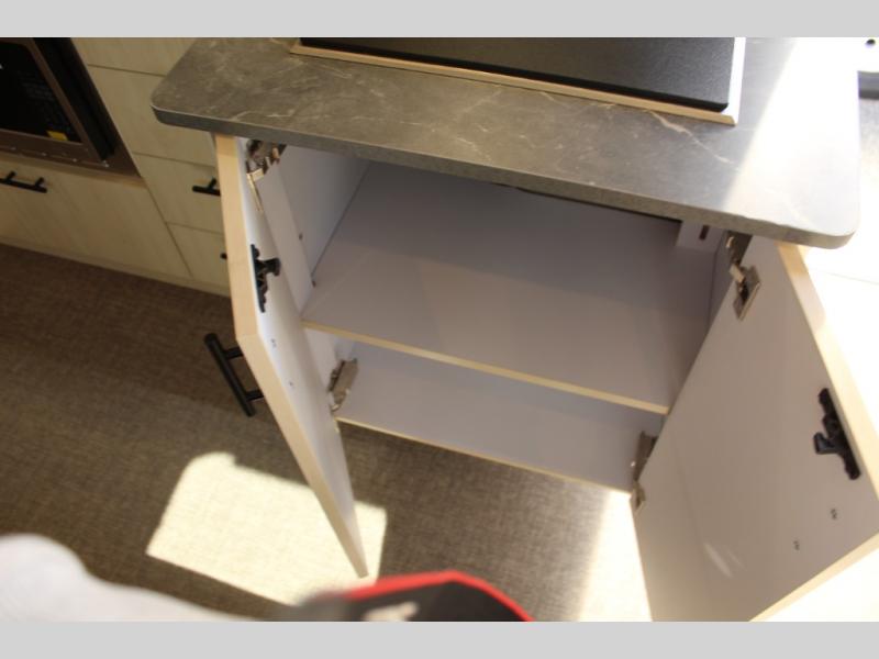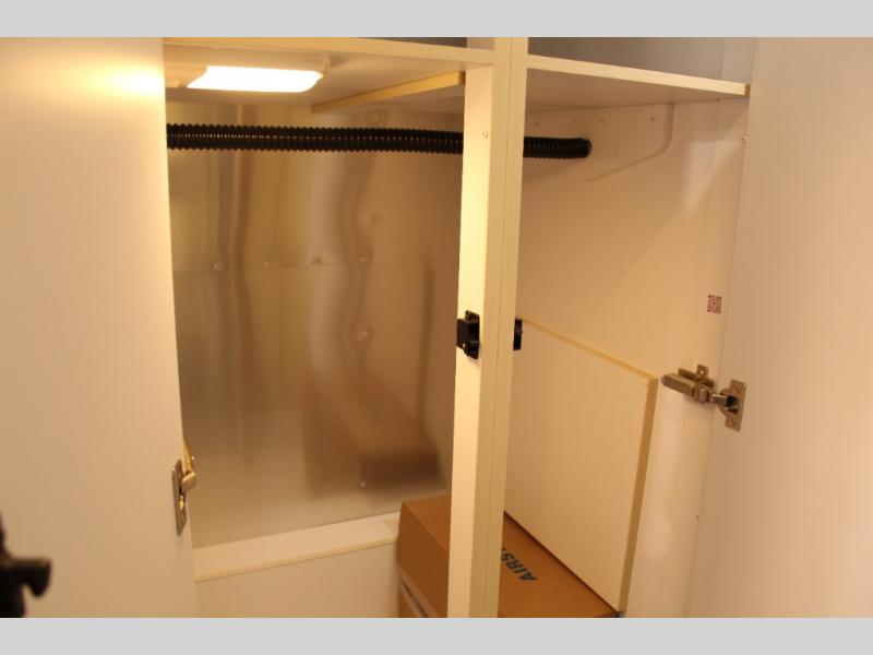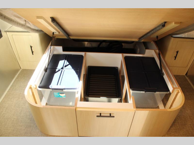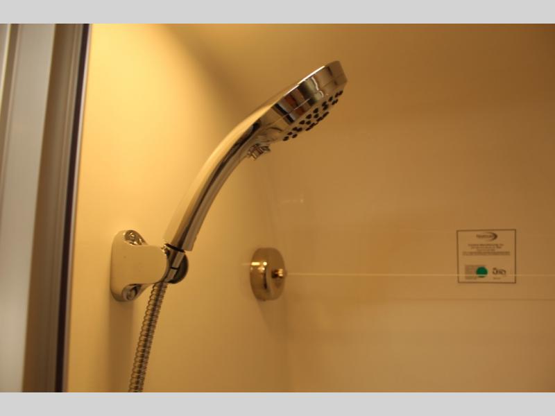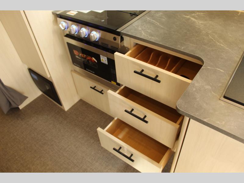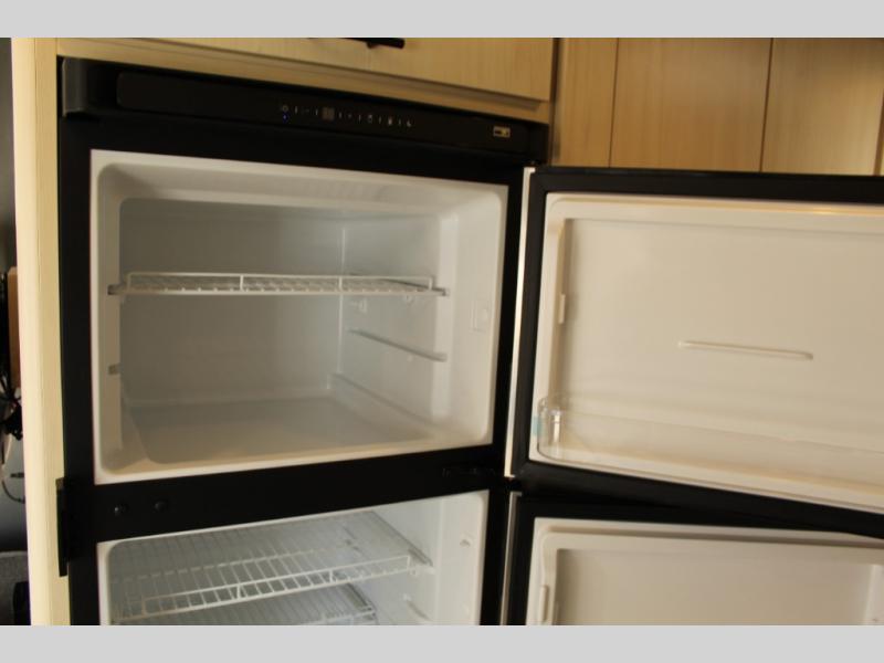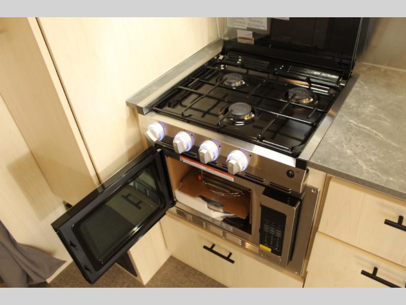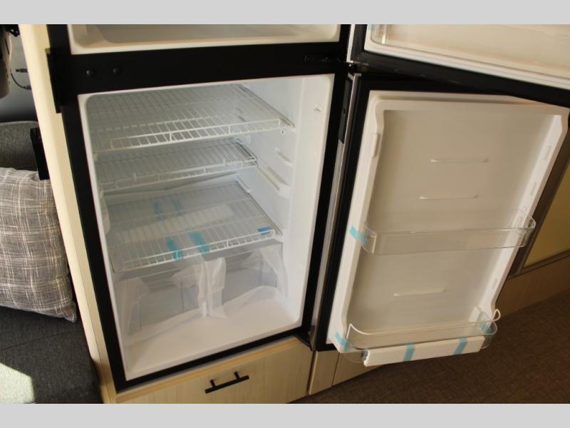 Whether you stay at a campground or an RV park, you will love relaxing inside on the comfortable furniture and the pillowtop memory foam mattress while gazing out all the windows and enjoying the natural lighting. The front master bedroom offers two nightstands for perfect storage for small items and books, and the counters are perfect for displaying accessories and charging devices, while the dinette and lounging area can easily be converted into sleeping space when you have guests stay the night. The toilet and vanity are separate from the independent shower allowing two people to use the facilities at once. And the cook will have a spacious galley to make meals using the stove/microwave area with stainless steel sink, and the refrigerator can hold the leftovers that is opposite the stove. And you might even like to add a few options such as a front bunk option over the queen bed, an optional rear hatch, or optional twin beds in place of the queen bed!