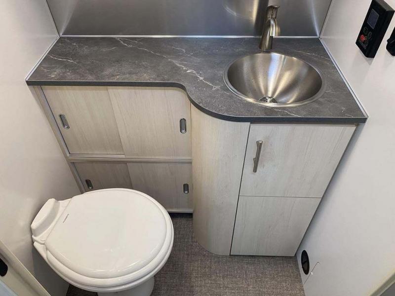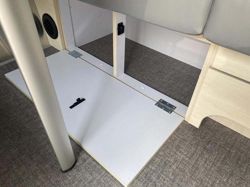 Whether you stay at a campground or an RV park, you will love relaxing inside on the comfortable furniture and the pillowtop memory foam mattress while gazing out all the windows and enjoying the natural lighting. The front master bedroom offers two nightstands for perfect storage for small items and books, and the counters are perfect for displaying accessories and charging devices, while the dinette and lounging area can easily be converted into sleeping space when you have guests stay the night. The toilet and vanity are separate from the independent shower allowing two people to use the facilities at once. And the cook will have a spacious galley to make meals using the stove/microwave area with stainless steel sink, and the refrigerator can hold the leftovers that is opposite the stove. And you might even like to add a few options such as a front bunk option over the queen bed, an optional rear hatch, or optional twin beds in place of the queen bed! The Midnight Flamingo optional upgrade is also available on this model for even more striking style and functional upgrades!
