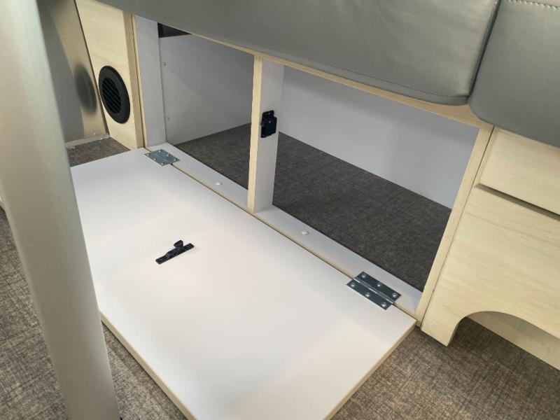Whether you stay at a campground or an RV park, you will love relaxing inside on the comfortable furniture and the pillowtop memory foam mattress while gazing out all the windows and enjoying the natural lighting. The front master bedroom offers two nightstands for perfect storage for small items and books, and the counters are perfect for displaying accessories and charging devices, while the dinette and lounging area can easily be converted into sleeping space when you have guests stay the night. The toilet and vanity are separate from the independent shower allowing two people to use the facilities at once. And the cook will have a spacious galley to make meals using the stove/microwave area with stainless steel sink, and the refrigerator can hold the leftovers that is opposite the stove. And you might even like to add a few options such as a front bunk option over the queen bed, an optional rear hatch, or optional twin beds in place of the queen bed! The Midnight Flamingo optional upgrade is also available on this model for even more striking style and functional upgrades!