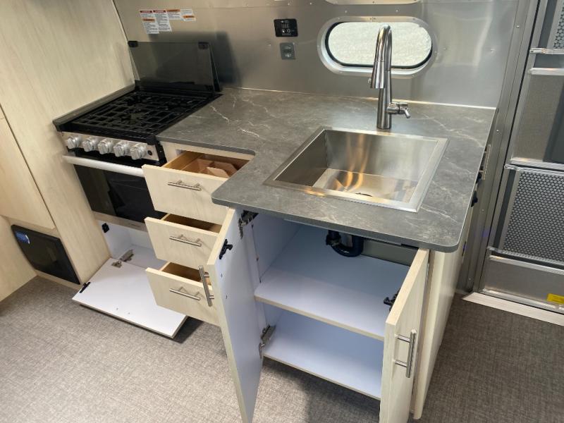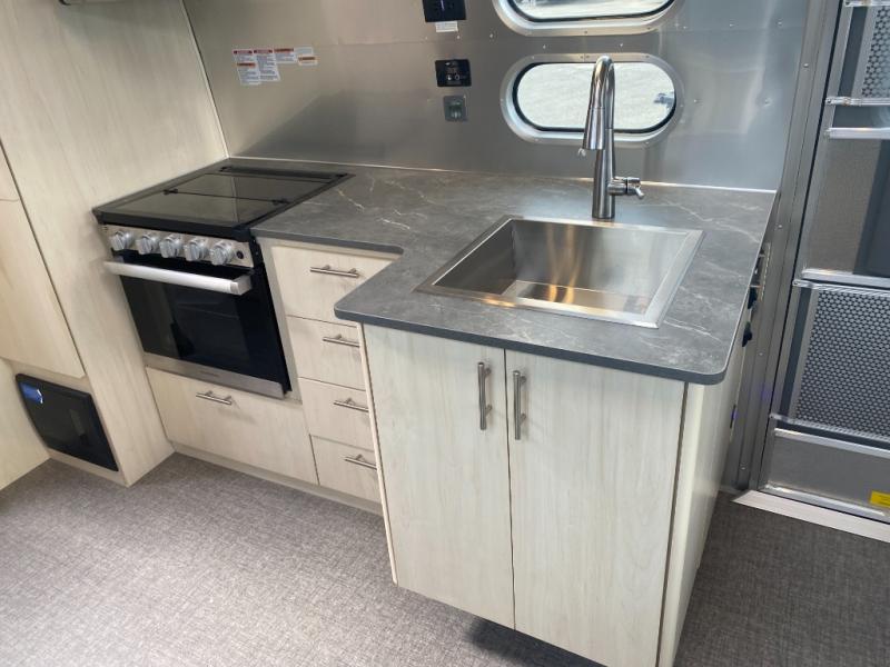 The family-friendly and popular Flying Cloud travel trailers by Airstream are built for ease of towing with a rear-view camera to make reversing and parking easier and stainless steel front stone guards to protect the lower segments from road debris. The iconic Airstream design is created outside and inside by the semi-monocoque aluminum superstructure, the temperature reducing one-piece white aluminum roof, the panoramic front windows, and the stylish aluminum wheels. The interior will have you feeling right at home with handcrafted cabinetry, plenty of storage and counter space, sleek roller blinds and blackout curtains, plus residential style faucets!
