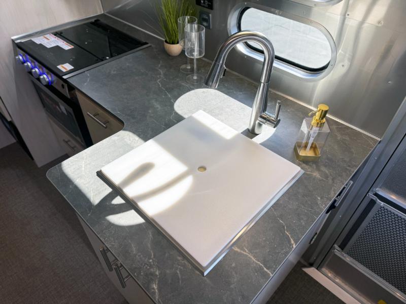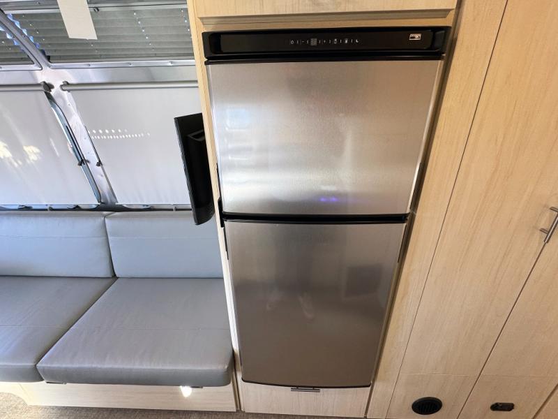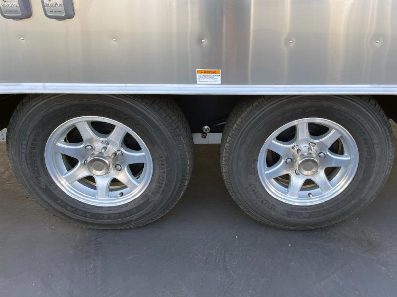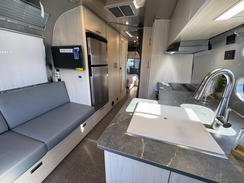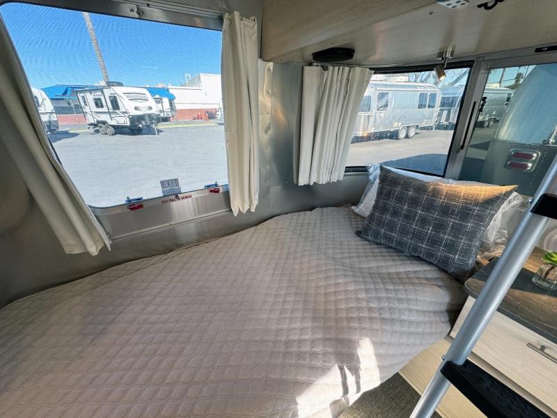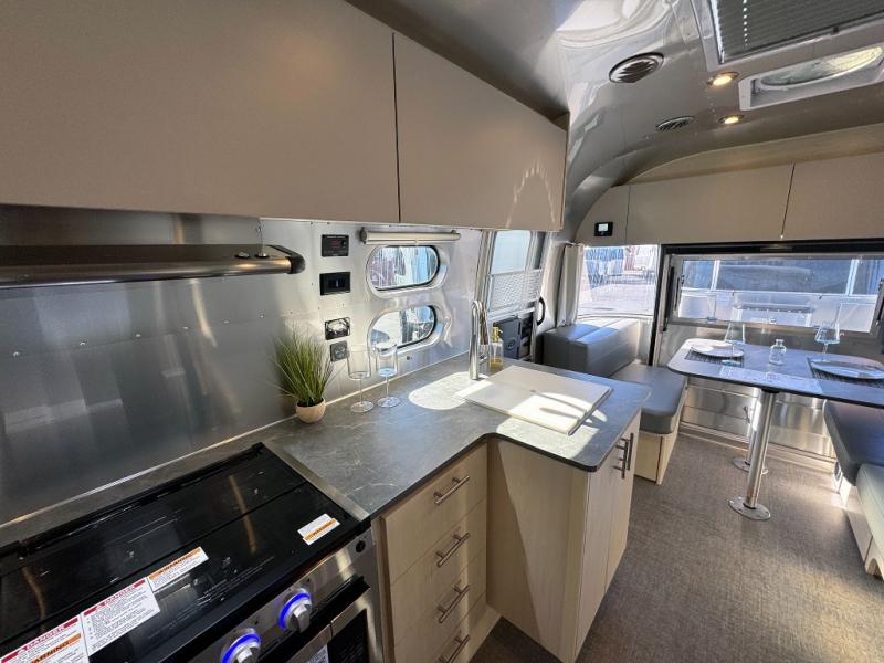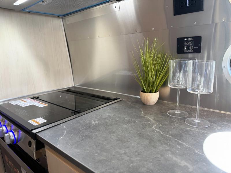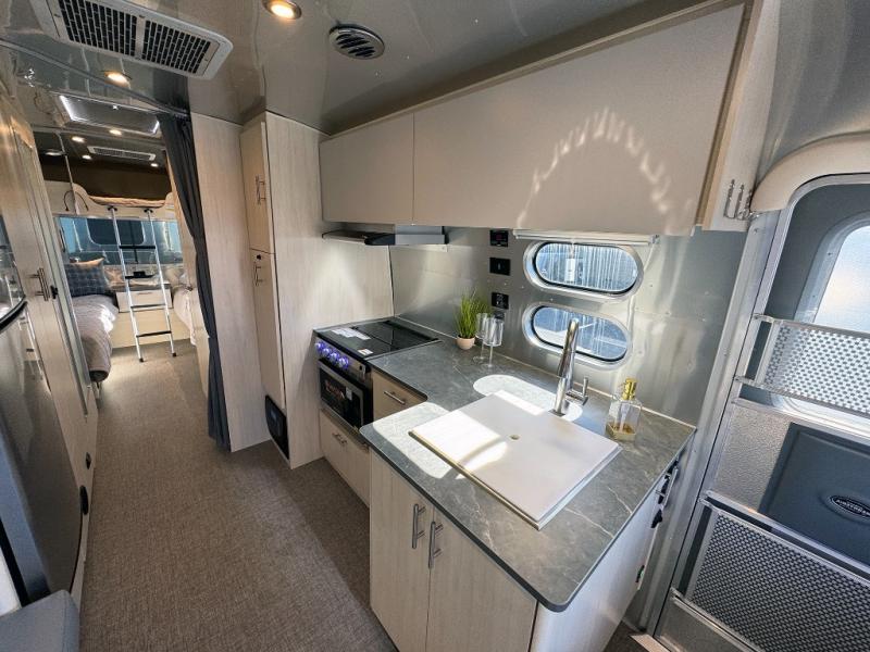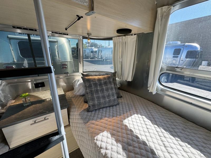 With each Flying Cloud travel trailer by Airstream, there are two axles, and each is built for ease of towing, plus there is a rear-view camera to make reversing and parking easier, and stainless steel front stone guards to protect the lower segments from road debris. The iconic Airstream design is created outside and inside by the semi-monocoque aluminum superstructure, the temperature reducing one-piece white aluminum roof, the panoramic front windows, and the stylish aluminum wheels. The interior will have you feeling right at home with handcrafted cabinetry, plenty of storage and counter space, sleek roller blinds and blackout curtains, plus residential style faucets!