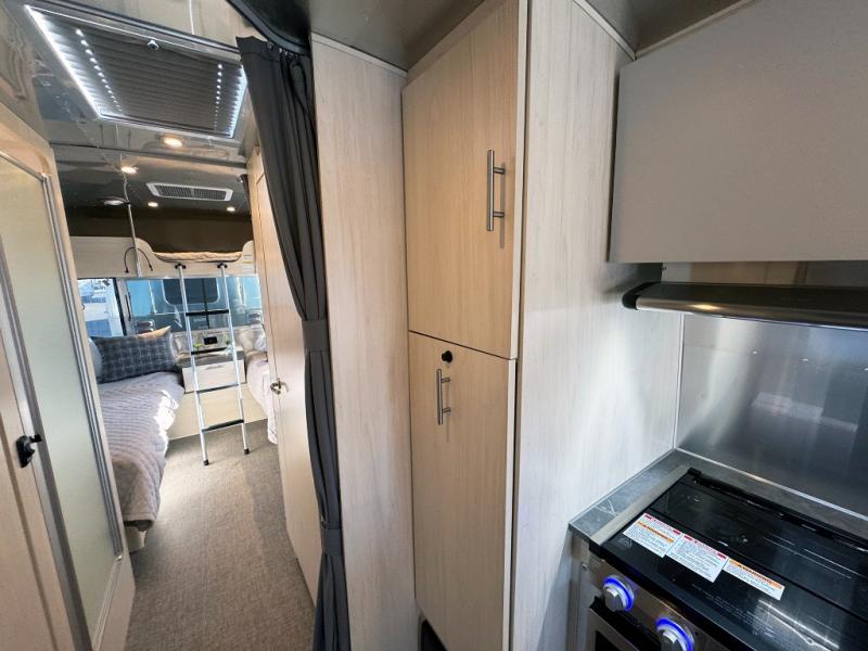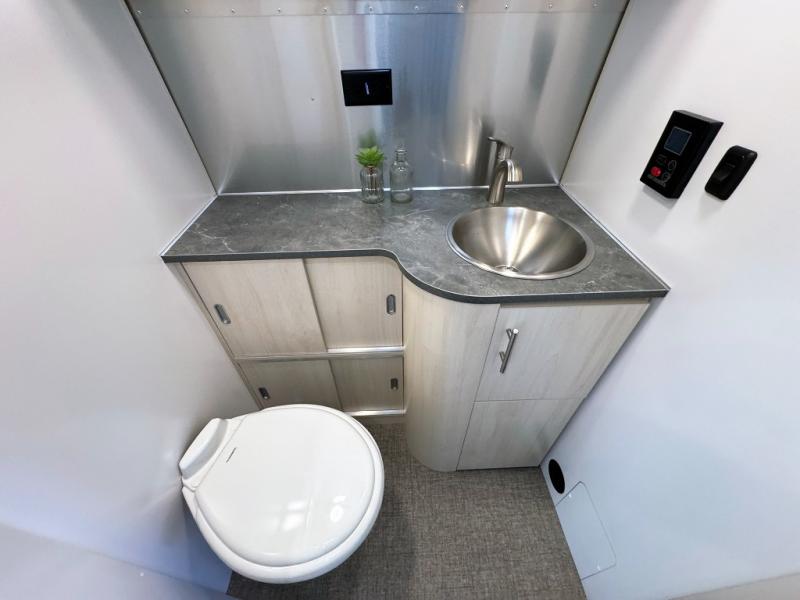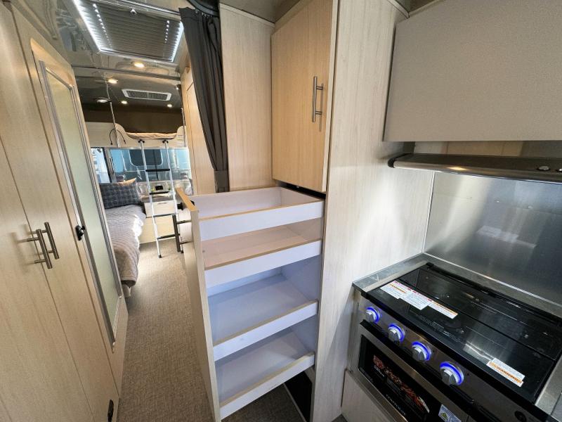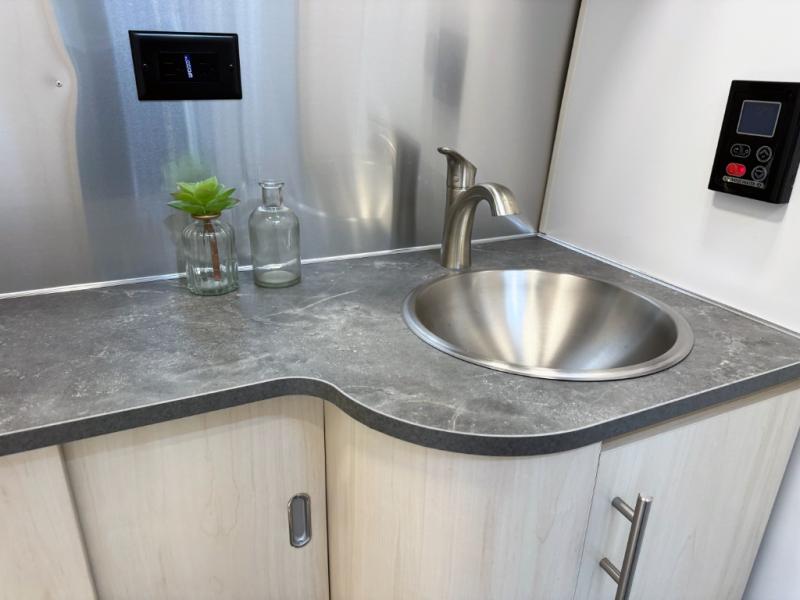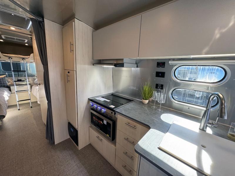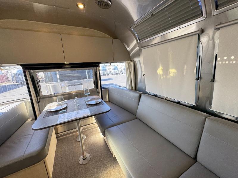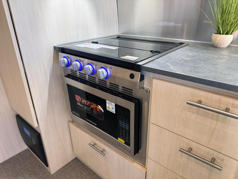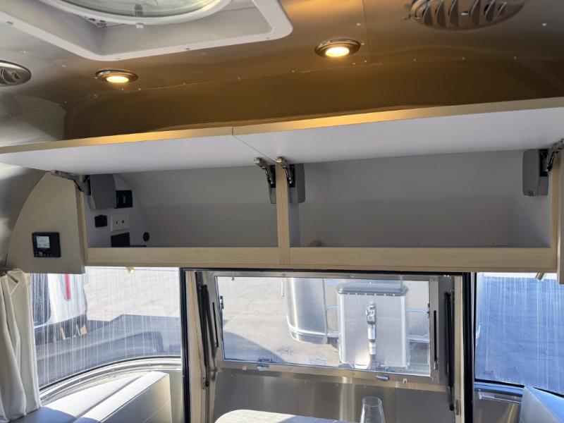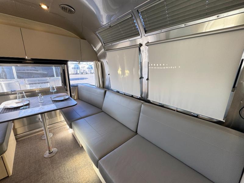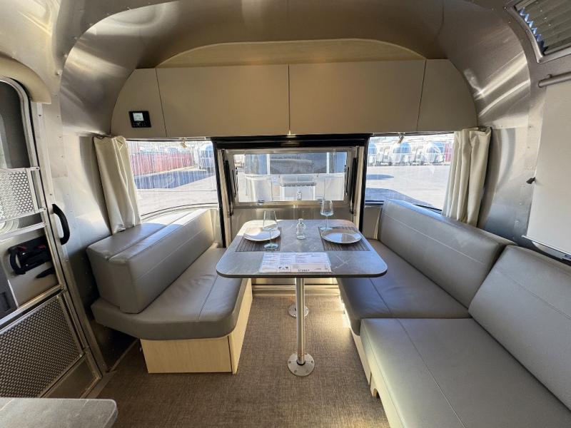 With each Flying Cloud travel trailer by Airstream, there are two axles, and each is built for ease of towing, plus there is a rear-view camera to make reversing and parking easier, and stainless steel front stone guards to protect the lower segments from road debris. The iconic Airstream design is created outside and inside by the semi-monocoque aluminum superstructure, the temperature reducing one-piece white aluminum roof, the panoramic front windows, and the stylish aluminum wheels. The interior will have you feeling right at home with handcrafted cabinetry, plenty of storage and counter space, sleek roller blinds and blackout curtains, plus residential style faucets!