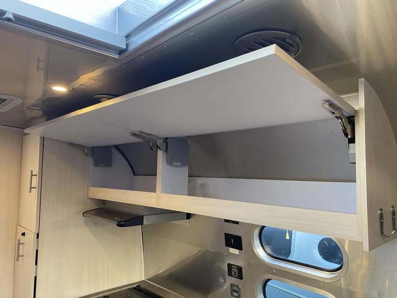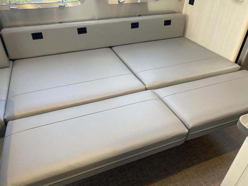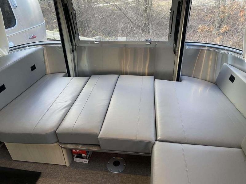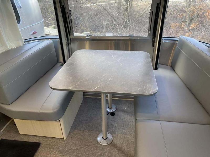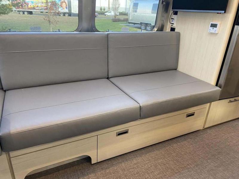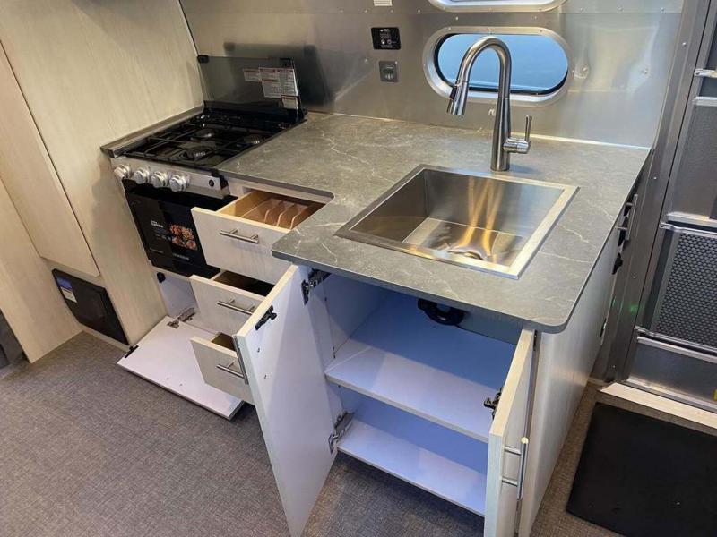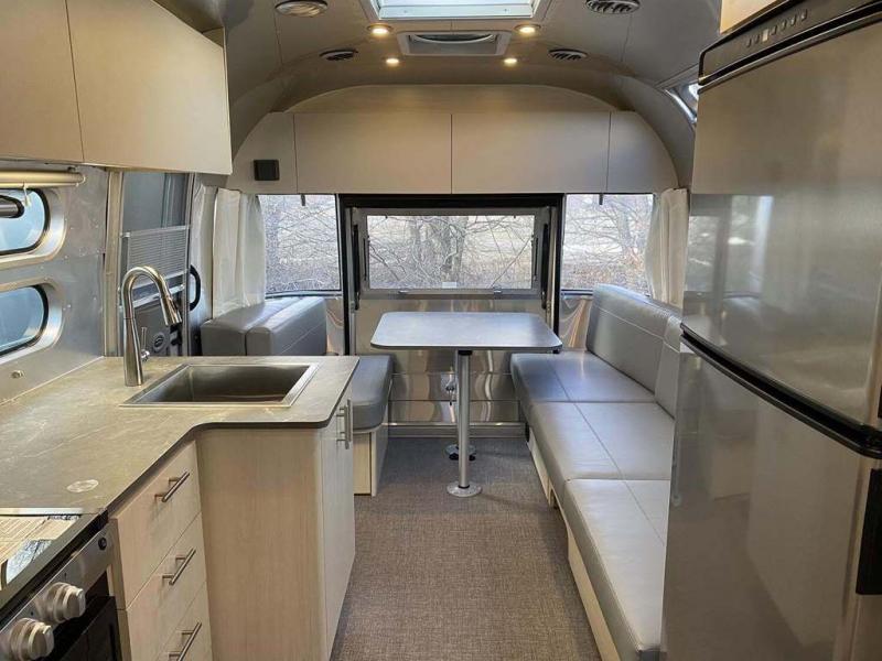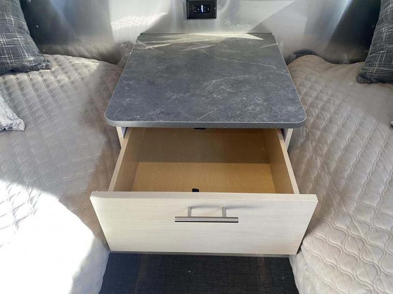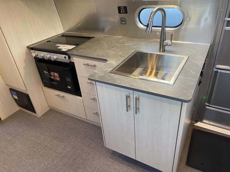 With each Flying Cloud travel trailer by Airstream, there are two axles, and each is built for ease of towing, plus there is a rear-view camera to make reversing and parking easier, and stainless steel front stone guards to protect the lower segments from road debris. The iconic Airstream design is created outside and inside by the semi-monocoque aluminum superstructure, the temperature reducing one-piece white aluminum roof, the panoramic front windows, and the stylish aluminum wheels. The interior will have you feeling right at home with handcrafted cabinetry, plenty of storage and counter space, sleek roller blinds and blackout curtains, plus residential style faucets!