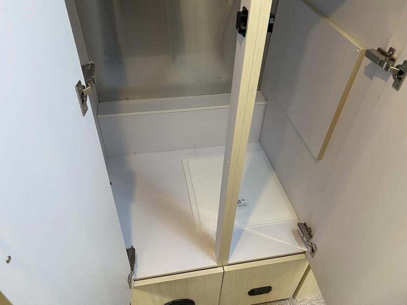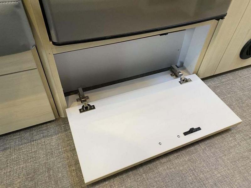 Whether you stay at a campground or an RV park, you will love relaxing inside on the comfortable furniture and the pillowtop memory foam twin mattresses while gazing out all the windows and enjoying the natural lighting. The toilet and vanity are separate from the shower allowing two people to use the facilities at once. And the cook will have a spacious galley to make meals using the stove/microwave area with square sink, and the refrigerator can hold the leftovers that is opposite the stove. And you might even like to add a few options such as a front bunk option over the queen bed, an optional rear hatch and/or a window awning package. The Midnight Flamingo optional upgrade is also available on this model for even more striking style and functional upgrades!
