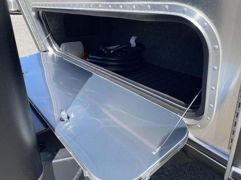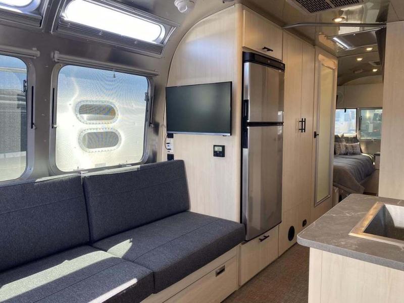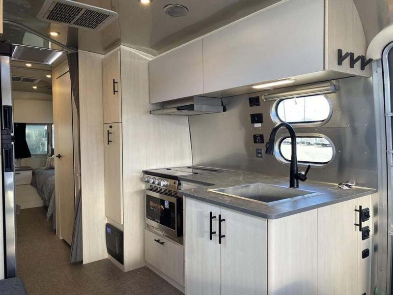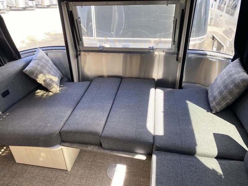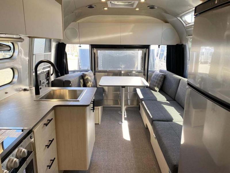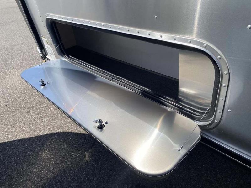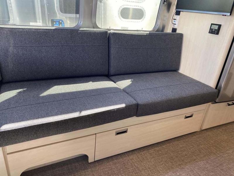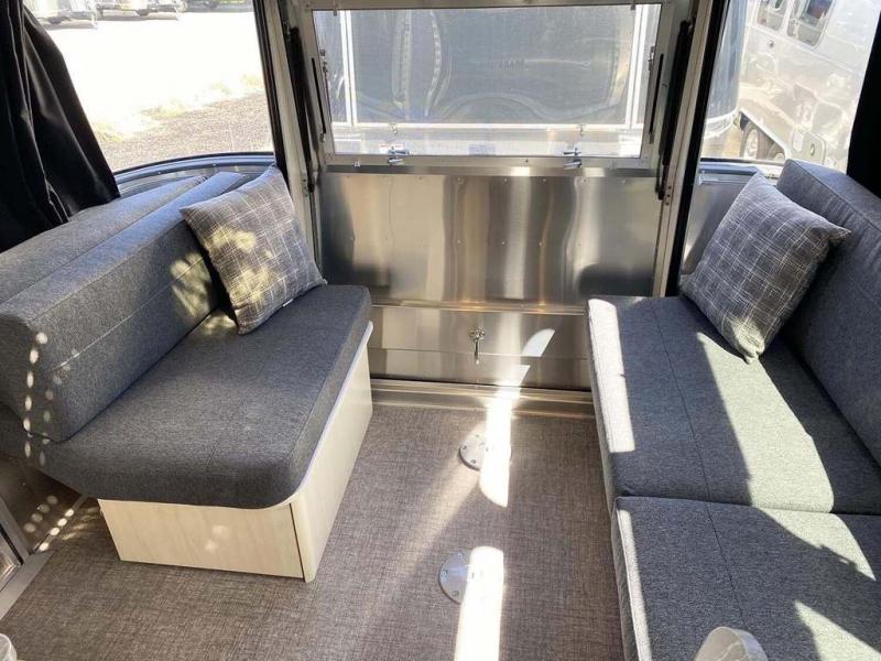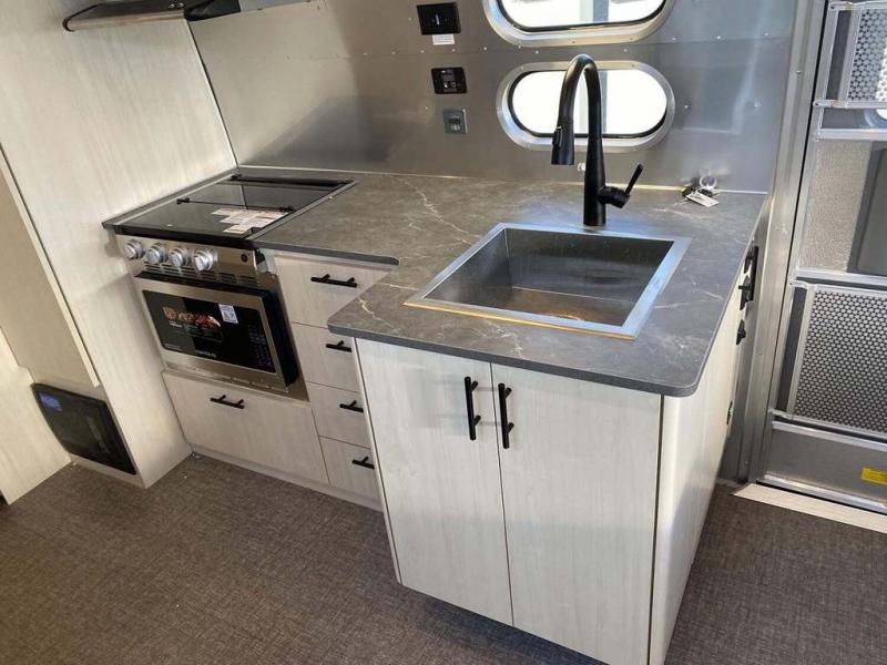 With each Flying Cloud travel trailer by Airstream, there are two axles, and each is built for ease of towing, plus there is a rear-view camera to make reversing and parking easier, and stainless steel front stone guards to protect the lower segments from road debris. The iconic Airstream design is created outside and inside by the semi-monocoque aluminum superstructure, the temperature reducing one-piece white aluminum roof, the panoramic front windows, and the stylish aluminum wheels. The interior will have you feeling right at home with handcrafted cabinetry, plenty of storage and counter space, sleek roller blinds and blackout curtains, plus residential style faucets!