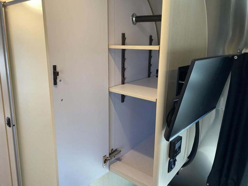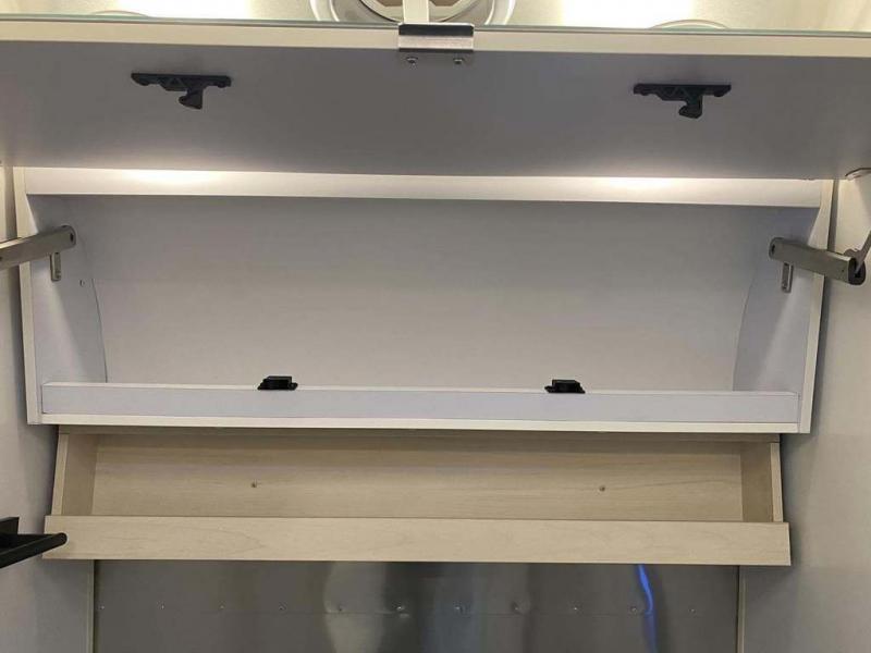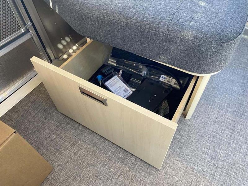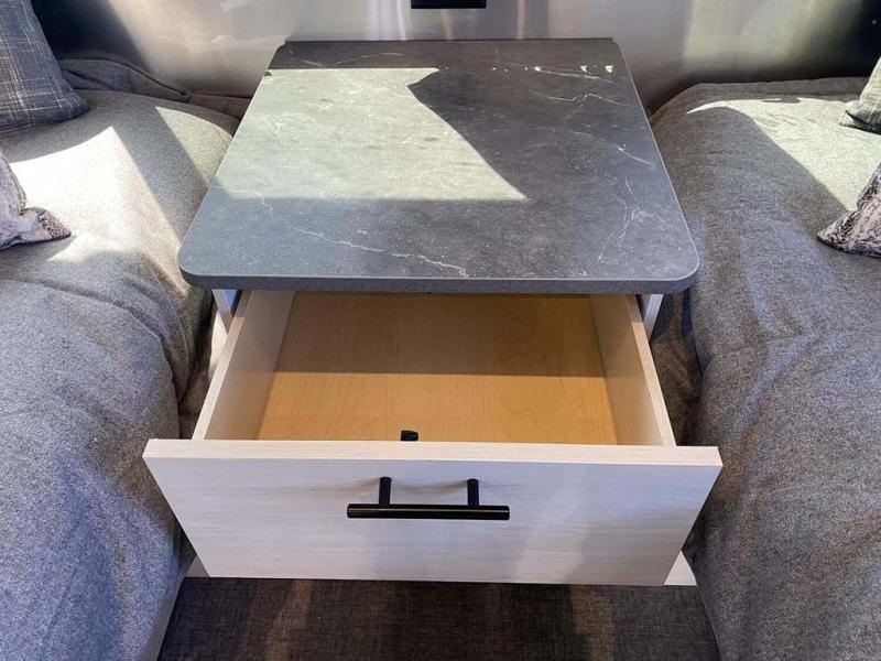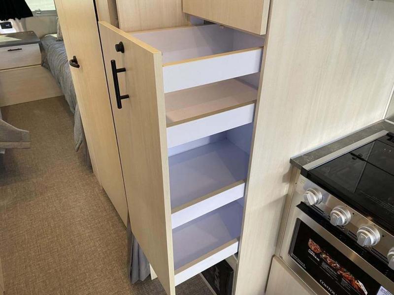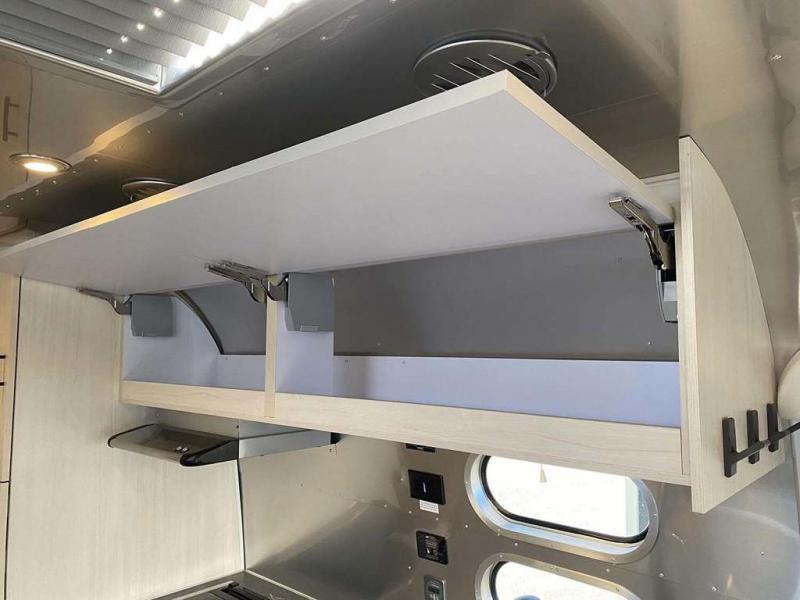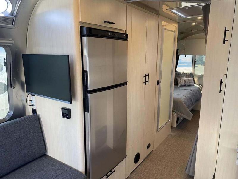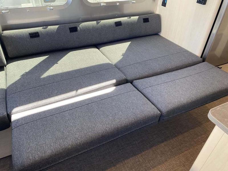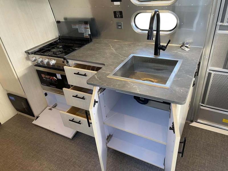 With each Flying Cloud travel trailer by Airstream, there are two axles, and each is built for ease of towing, plus there is a rear-view camera to make reversing and parking easier, and stainless steel front stone guards to protect the lower segments from road debris. The iconic Airstream design is created outside and inside by the semi-monocoque aluminum superstructure, the temperature reducing one-piece white aluminum roof, the panoramic front windows, and the stylish aluminum wheels. The interior will have you feeling right at home with handcrafted cabinetry, plenty of storage and counter space, sleek roller blinds and blackout curtains, plus residential style faucets!