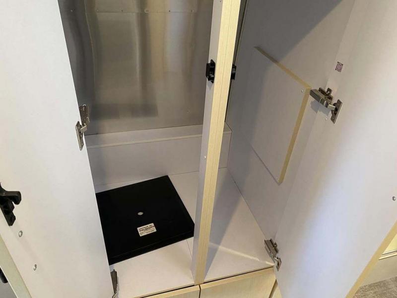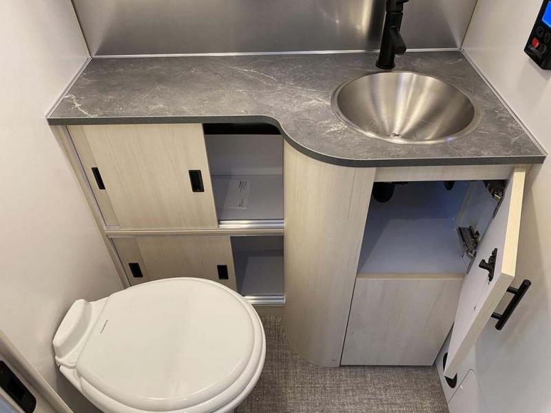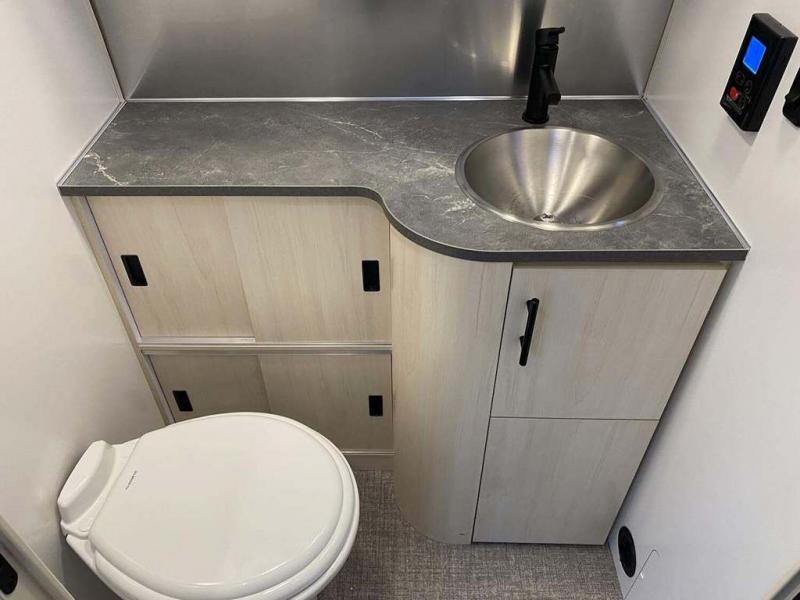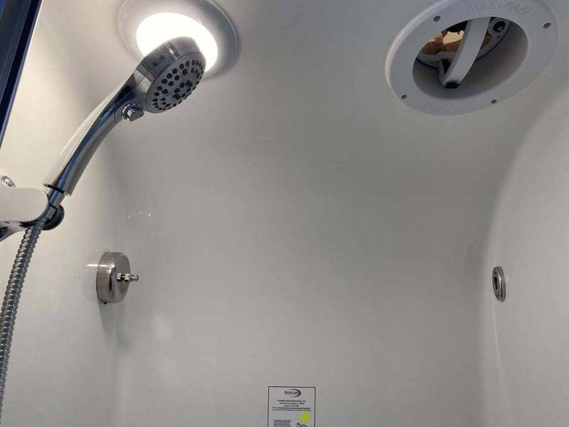 Whether you stay at a campground or an RV park, you will love relaxing inside on the comfortable furniture and the pillowtop memory foam twin mattresses while gazing out all the windows and enjoying the natural lighting. The toilet and vanity are separate from the shower allowing two people to use the facilities at once. And the cook will have a spacious galley to make meals using the stove/microwave area with square sink, and the refrigerator can hold the leftovers that is opposite the stove. And you might even like to add a few options such as a front bunk option over the queen bed, an optional rear hatch and/or a window awning package. The Midnight Flamingo optional upgrade is also available on this model for even more striking style and functional upgrades!