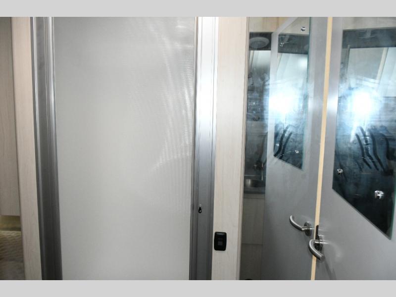 The rear bedroom features two comfortable twin beds, giving you your own personal retreat at the end of the day. This layout offers easier nighttime access and added storage, making it ideal for extended trips or travelers who value flexibility and convenience. The split bathroom enhances privacy and functionality, with a toilet and vanity on one side of the hall and a dedicated shower with its own door on the other, plus a nearby wardrobe for hanging clothes.