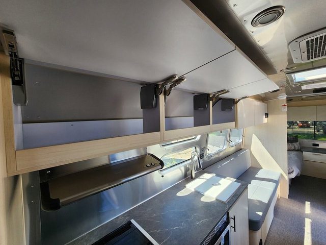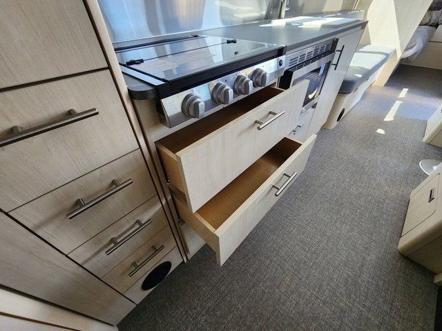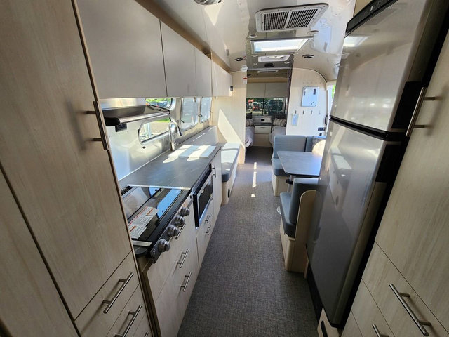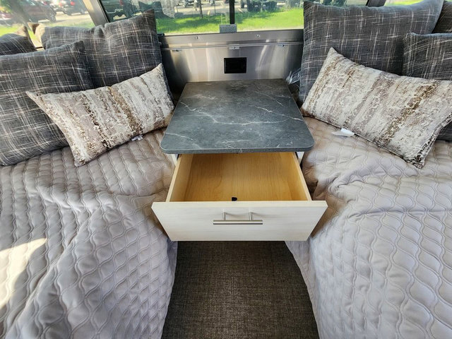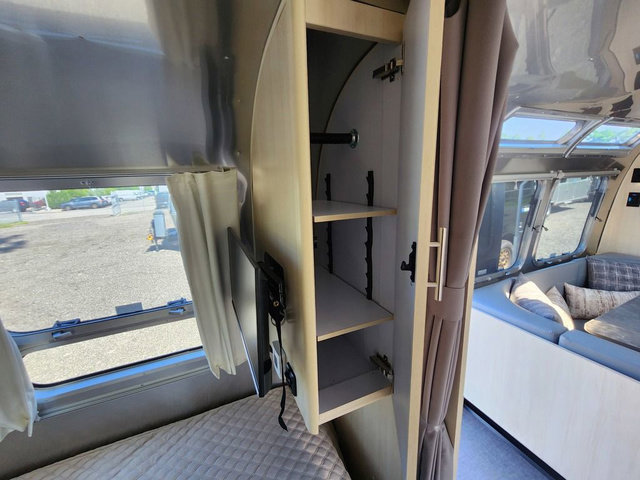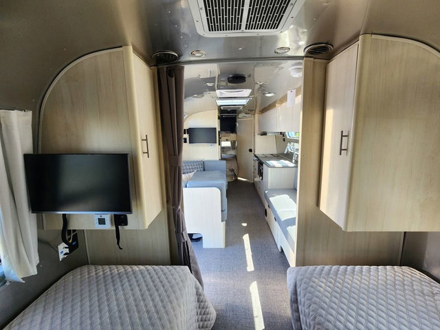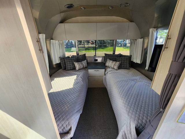 Looking for maximum interior space, a place for eight to sleep at night, plus plenty of storage for your big group? This trailer offers all of that plus so much more! The front private bedroom offers a queen bed with storage on each side to keep your clothing wrinkle free. The main living and kitchen area offers a U-shaped dinette for total comfort when dining, playing games and visiting with everyone. And the sofa offers more relaxation seating, while both furnishings provide extra sleeping space. The rear corner bunks offer a twin above a queen mattress that are designed to fit the curves of the Airstream perfectly. The full bathroom will keep you refreshed, and the kitchen is loaded with everything you need to feed the group. This model is also available with optional twin beds which replace the front queen bed!