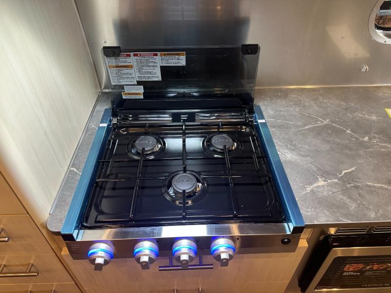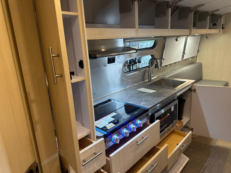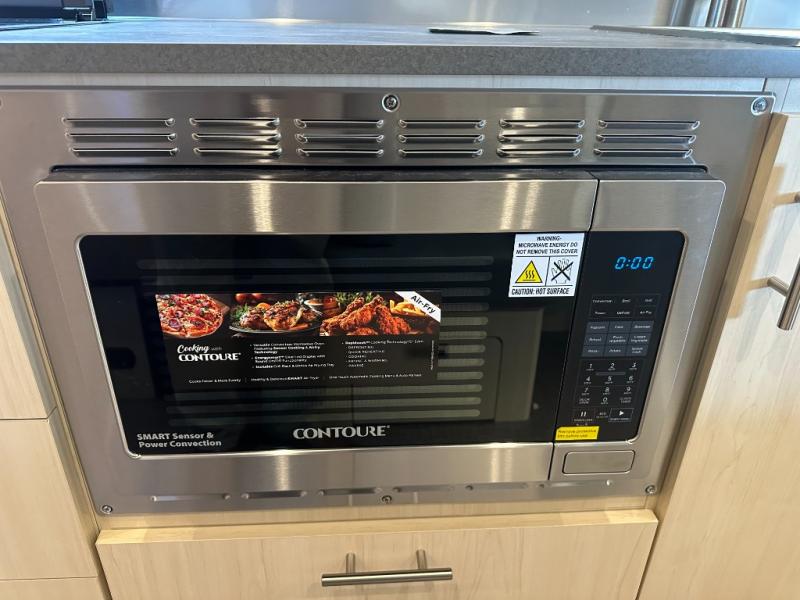 The kitchen is fully equipped for life on the road with a three-burner cooktop, microwave, refrigerator, and plenty of countertop and cabinet space. Whether you're prepping quick lunches between Zoom calls or cooking a full dinner for family, it’s ready for whatever your journey demands.