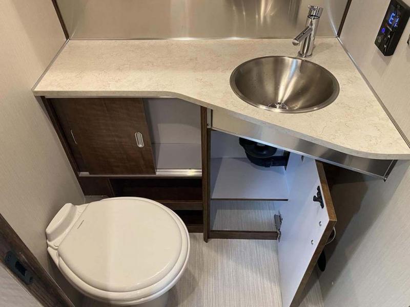 Enjoy a home away from home with this travel trailer! The L-shaped lounge provides a comfortable place to enjoy a meal, play a card game, and even transform into an extra sleeping space for a guest or two smaller guests. The ultra-modern kitchen has a stainless steel three burner cooktop, a Baraldi vent, a 6.8 cu. ft. refrigerator, and a deep stainless steel Moen sink to make clean up easier. The bright white DuPont Corian countertops help light bounce off of the aluminum walls making for a brighter atmosphere and they also have built-in multifunctional storage bins that are flush with the surface behind the sink. Up front there are twin beds with an AdaptaFlex memory foam mattress for you to enjoy a good night's rest or watch a movie with the LG LED TV. The separated bathroom allows one person to freshen up in the shower with a seat while another uses the private toilet and vanity!