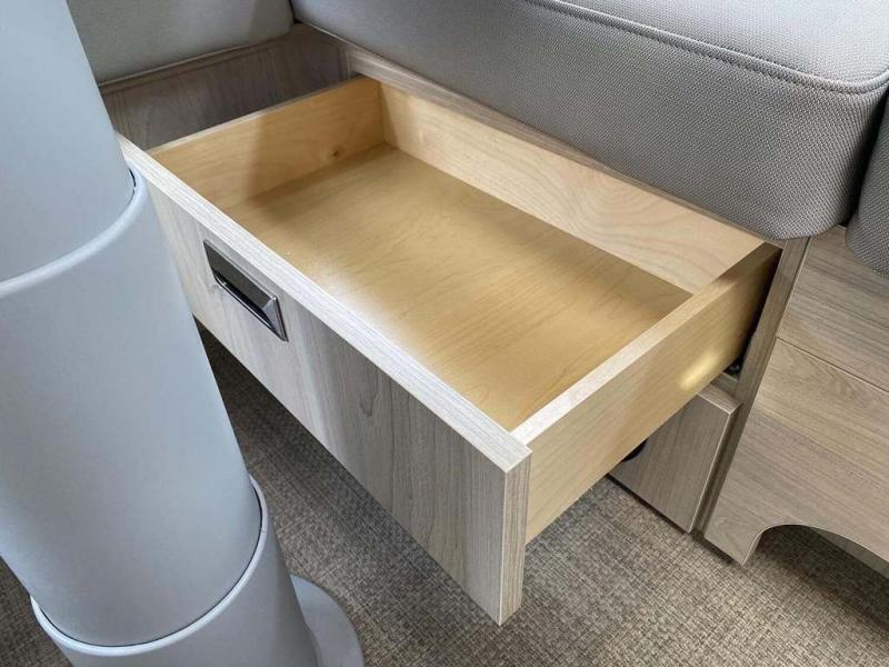 You will find comfort and luxury all throughout this travel trailer! From the front twin beds with an AdaptaFlex memory foam mattress, nightstands on either side, and a LG LED TV to the rear L-shaped lounge that you can enjoy your meals at and convert into an extra sleeping space. The separated bathroom has a private toilet and vanity together across from an independent shower with a seat to freshen up each morning. You can prepare your best meals in the ultra-modern kitchen with the stainless steel three burner cooktop, the oven, the deep stainless steel Moen sink, and the DuPont Corian countertops will be easy to clean, plus they have multifunctional storage bins that are flush to the surface behind the sink.