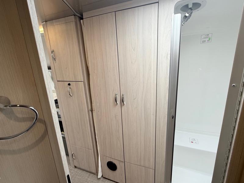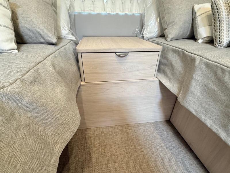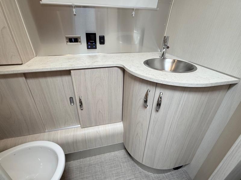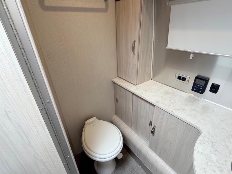 Start traveling the country in true luxury with this travel trailer! It features a front wrap around lounge with stain resistant Spradling Hitch fabric that can be pulled out and the table lowered to create a 38" x 84" bed. A separated bathroom makes it easy for one person to freshen up in the shower with a seat while another is across the way utilizing the private toilet and vanity. The rear queen bed has an AdaptaFlex memory foam mattress to enjoy a good night's rest, nightstands to set your glass of water, and an HD 12V TV to watch your favorite movie in bed. You will find plenty of storage throughout between the upper and lower kitchen cabinets, a slide-out pantry, multifunctional storage bins that are flush to the surface behind the deep stainless steel Moen sink, under-the-bed storage, and a closet to hang your clothes.