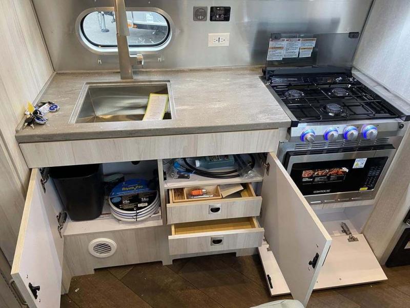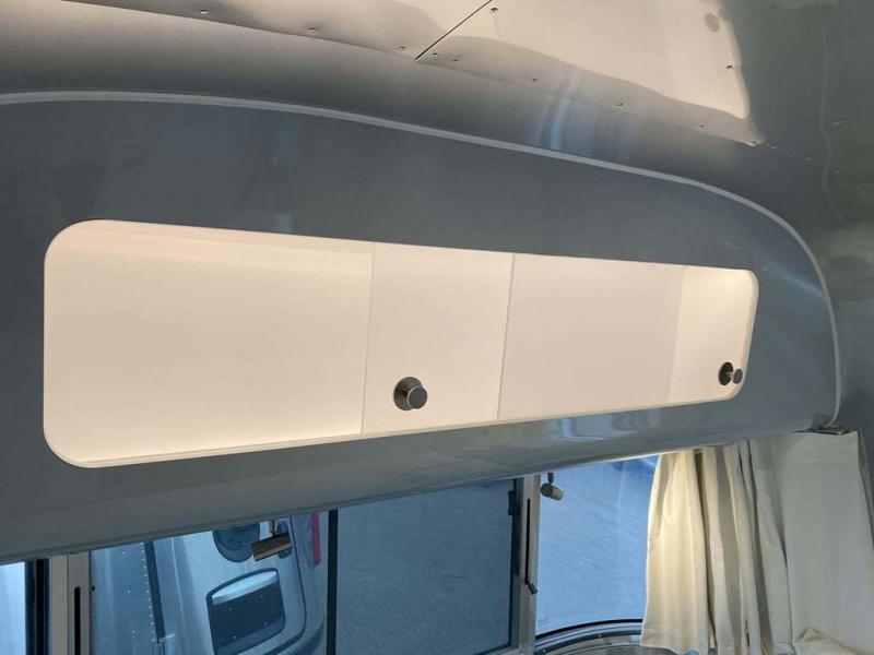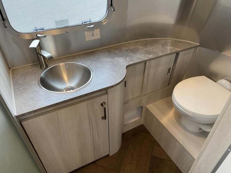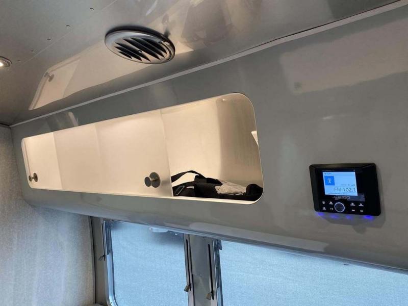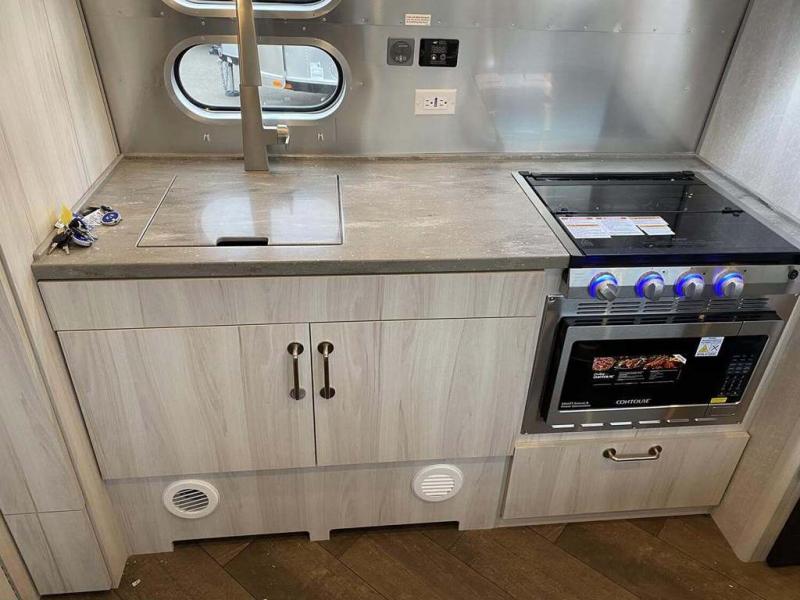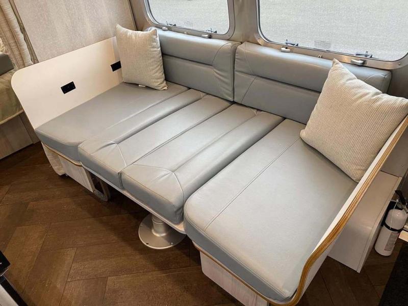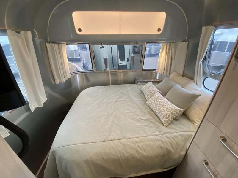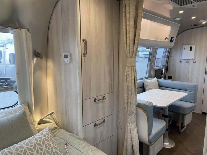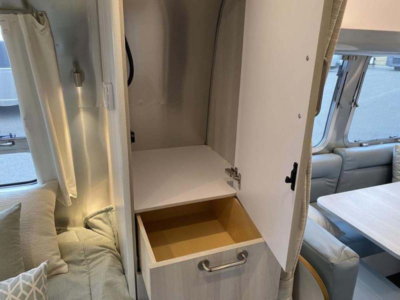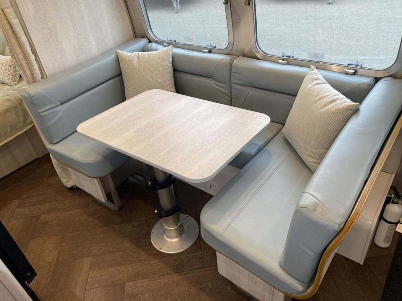 Every time you step foot into the Airstream International travel trailer, you will feel as if you are breathing in a breath of fresh air! The fresh coastal décor was inspired by the waterfront, and the stylish interior delivers a relaxing environment and comfortable luxury. The panoramic windows increase the amount of natural sunlight that streams through to the interior, but they also have blackout shades that you can close whenever you need a darkened room. The beautiful handcrafted marine-grade Lite-Ply laminated cabinetry is an attractive base for the overhead storage lockers that have sliding doors and LED lighting. The dimmable interior LED lighting will create the perfect amount of illumination for you as you spend time indoors. The exterior has excellent features as well with its enclosed aluminum insulated heated underbelly, unique front door key with heavy-duty deadbolt, optional solar package, solar front window protection, and exterior shower with hot and cold water.