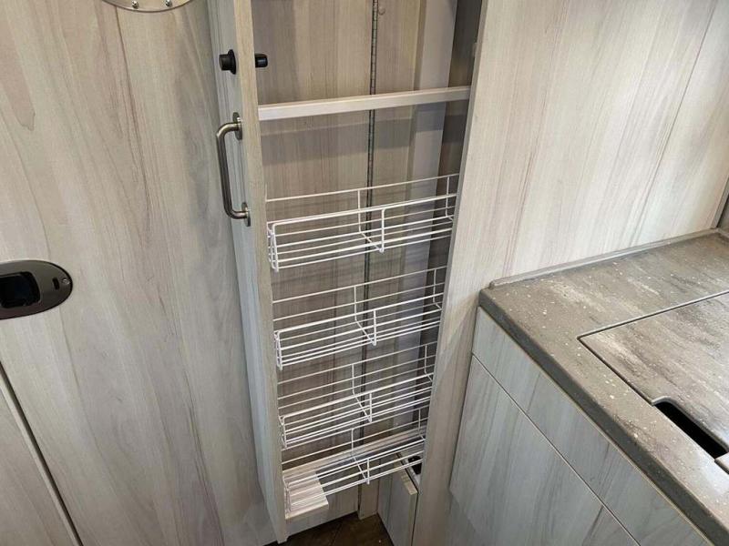 What kind of an adventurer are you? Are you the kind that enjoys having modern features and a calming environment? If you are, you absolutely must check out this International travel trailer! You will love having your own little sanctuary to retreat to while you are away. The front 60" x 75" queen bed or optional twin beds will be THE place to spend your mornings because you can prop yourself up against the sleeping pillows and decorative throw pillows while you sip on a hot cup of coffee and admire the amazing views coming through the surrounding panoramic windows. There is also a 24" 12V DC Smart TV included in this area so you can catch up on the news. The wardrobe with a hanging bar will ensure that your clothes stay wrinkle free, and you can also use the retractable clothes line in the spacious shower to let some clothes air dry.