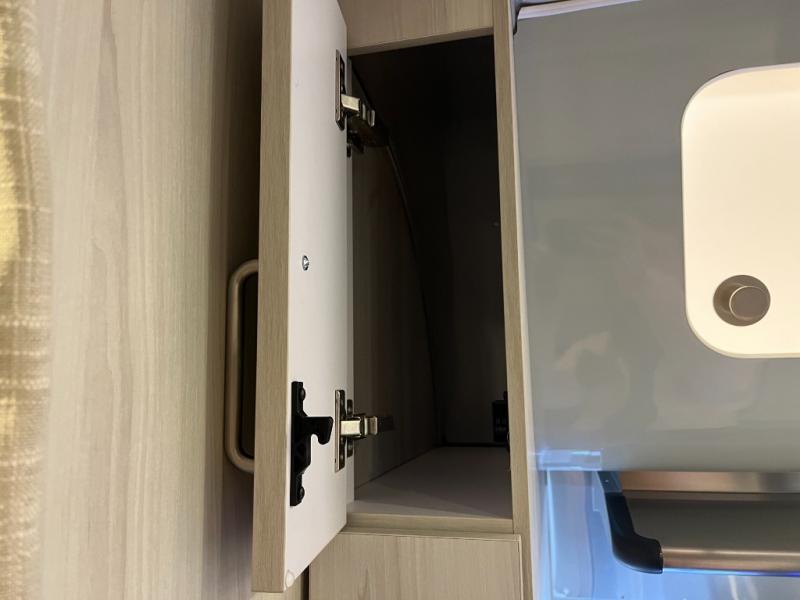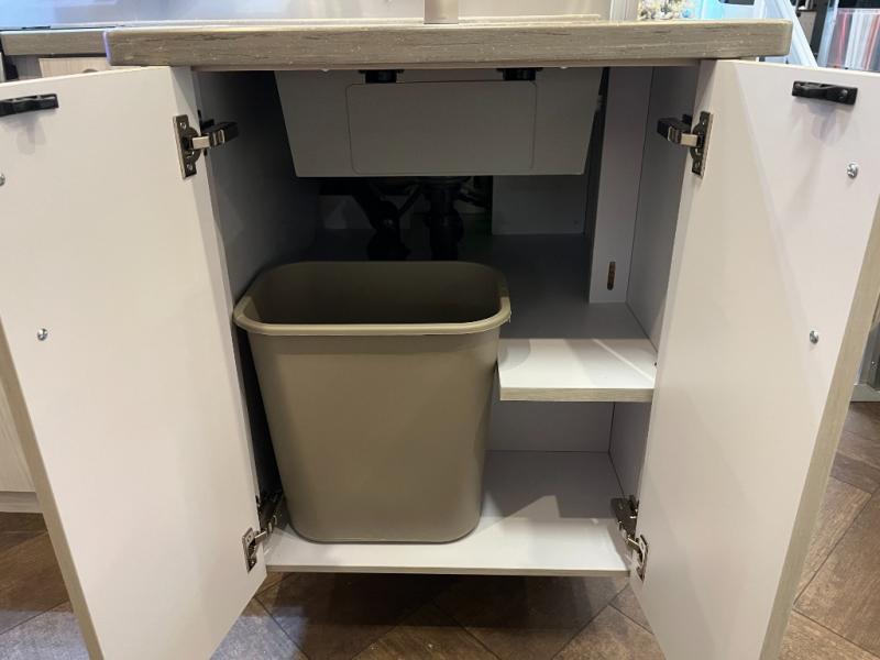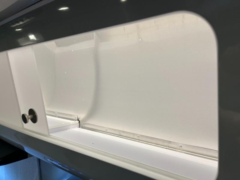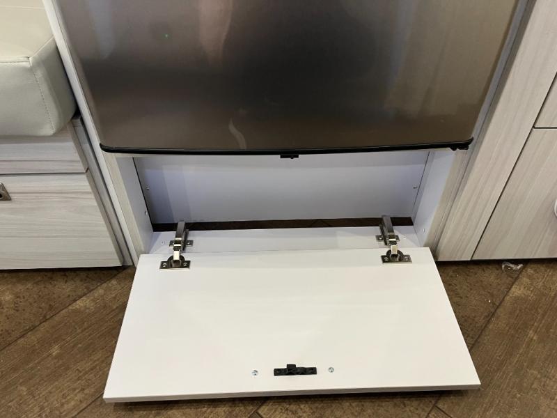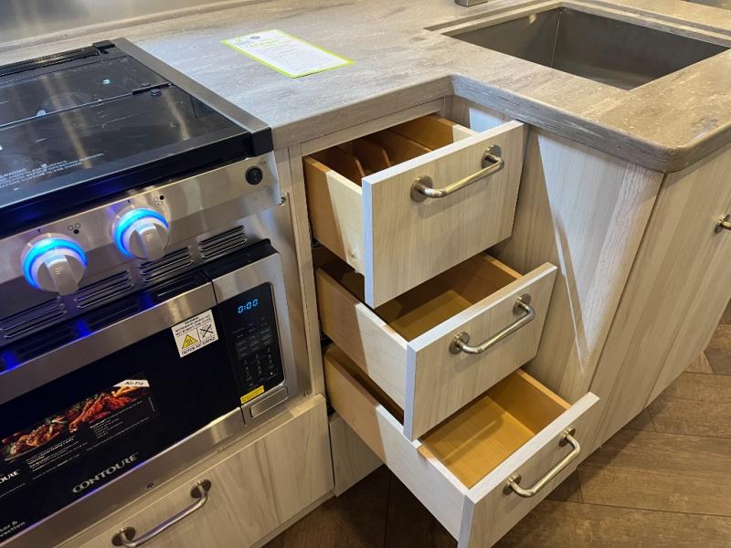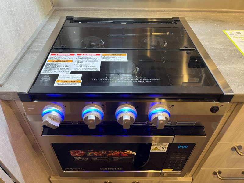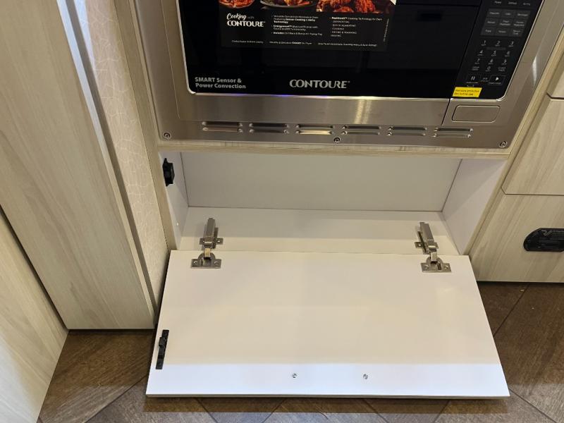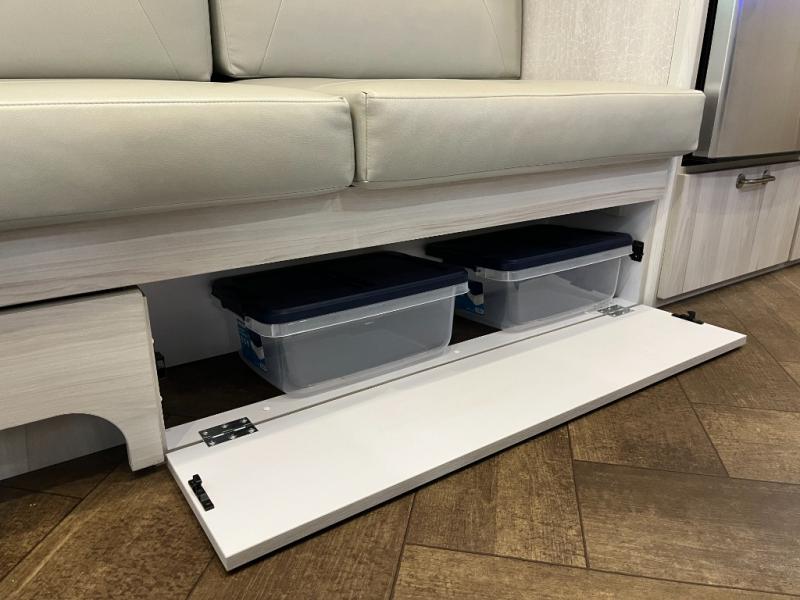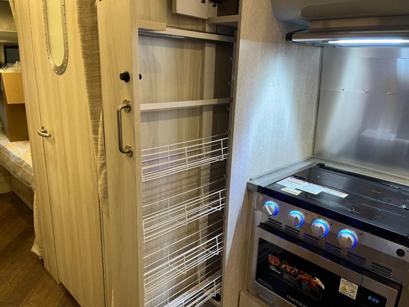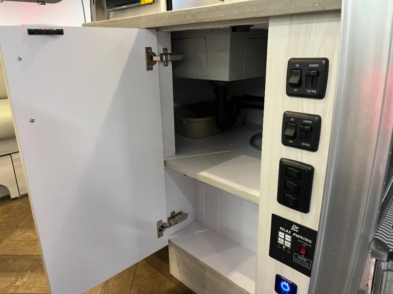 Inside, you’ll find a beautifully designed space that feels both airy and sophisticated. The front bedroom features plush twin beds that deliver personal comfort while opening the walkway for easier access. The spacious dinette and lounge area provide the ideal setup for relaxing, working remotely, or enjoying a meal with a view. A fully equipped galley kitchen features high-end appliances, a stainless sink, generous counter space, and smart storage solutions that make cooking on the road simple and enjoyable.