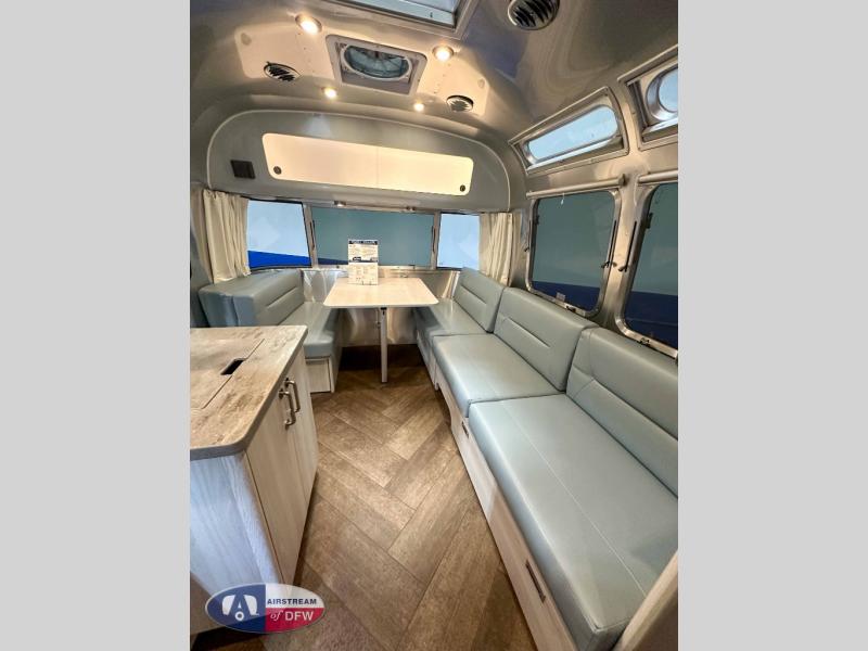 Every time you step foot into the Airstream International travel trailer, you will feel as if you are breathing in a breath of fresh air! The fresh coastal décor was inspired by the waterfront, and the stylish interior delivers a relaxing environment and comfortable luxury. The panoramic windows increase the amount of natural sunlight that streams through to the interior, but they also have blackout shades that you can close whenever you need a darkened room. The beautiful handcrafted Italian Lite-Ply laminated cabinetry is an attractive base for the overhead storage lockers that have sliding doors and LED lighting. The dimmable interior LED lighting will create the perfect amount of illumination for you as you spend time indoors. The exterior has excellent features as well with its enclosed aluminum insulated heated underbelly, unique front door key with heavy-duty deadbolt, optional solar package, solar front window protection, and exterior shower with hot and cold water.