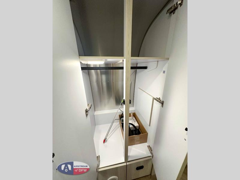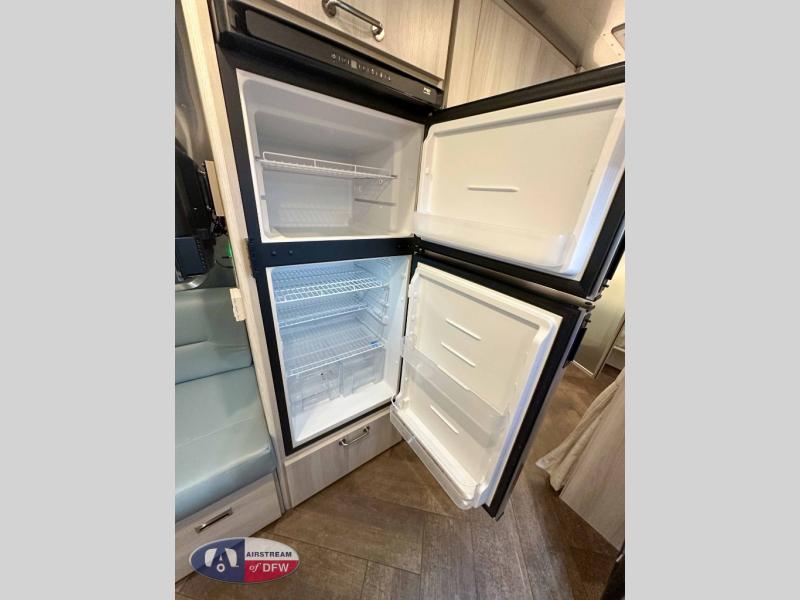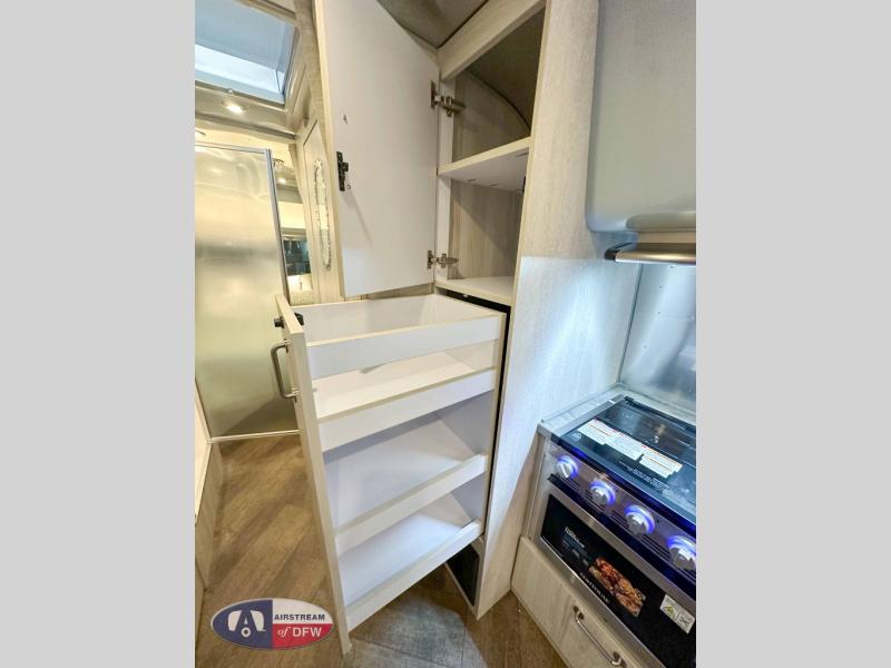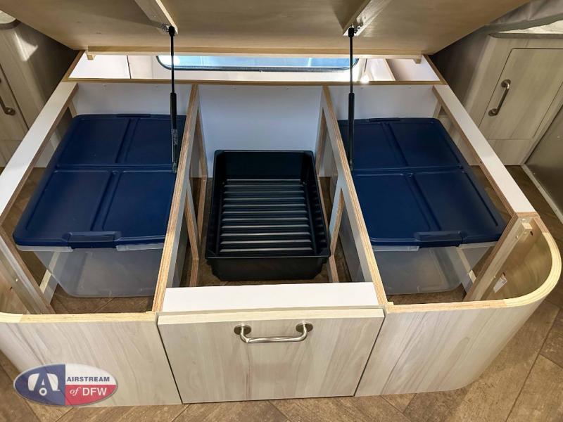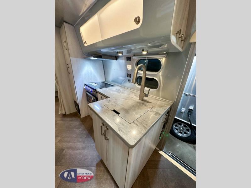 The first thing you will notice about this International travel trailer is the calming atmosphere! Airstream has done a wonderful job of creating a tranquil sanctuary for you to take your vacations in. The kitchen has a three-burner cooktop, stainless steel sink, 8 cu. ft. refrigerator, and microwave so that you can create new and exciting dishes each time you are away. This trailer also has excellent storage space with the overhead storage lockers, the wardrobe with hanging bar, the under-bed storage, and the exterior storage compartment. You can also find great entertainment as you spend your time in this trailer because the two 12V DC Smart TVs will allow you to watch a movie on the Blu-Ray DVD player. Some available options for this model include the optional twin beds in place of the queen bed and the optional rear hatch with a front bunk. If the front bunk option is chosen, it will replace the overhead storage in the bedroom!