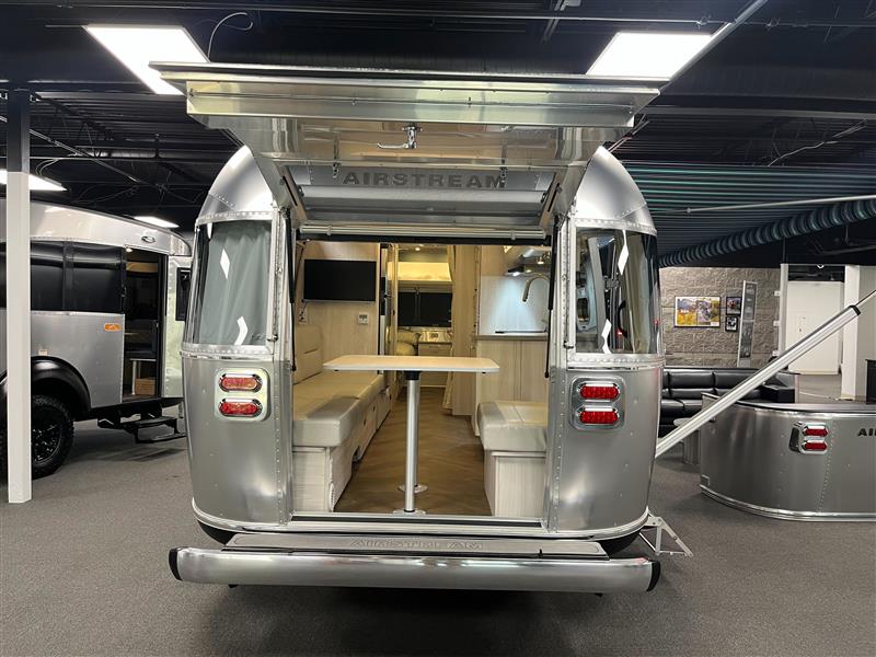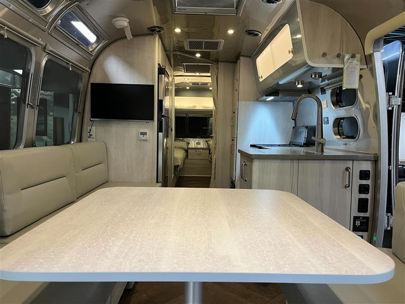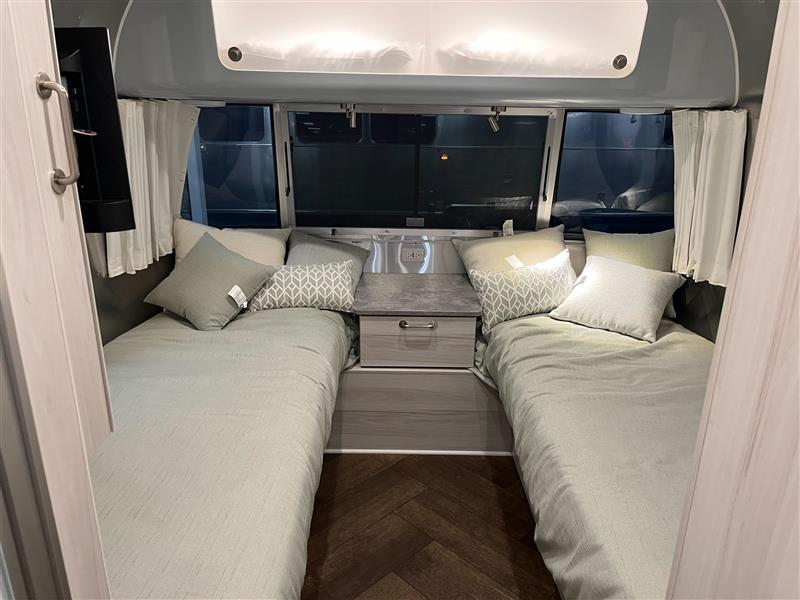 The first thing you will notice about this International travel trailer is the calming atmosphere! Airstream has done a wonderful job of creating a tranquil sanctuary for you to take your vacations in. The kitchen has a three-burner cooktop, stainless steel sink, 8 cu. ft. refrigerator, and microwave so that you can create new and exciting dishes each time you are away. This trailer also has excellent storage space with the overhead storage lockers, the wardrobe with hanging bar, the under-bed storage, and the exterior storage compartment. You can also find great entertainment as you spend your time in this trailer because the two 12V DC Smart TVs will allow you to watch a movie on the Blu-Ray DVD player. Some available options for this model include the optional twin beds in place of the queen bed and the optional rear hatch with a front bunk. If the front bunk option is chosen, it will replace the overhead storage in the bedroom!