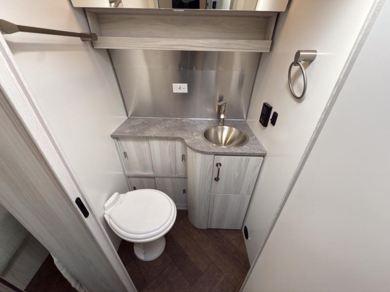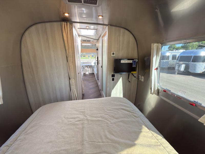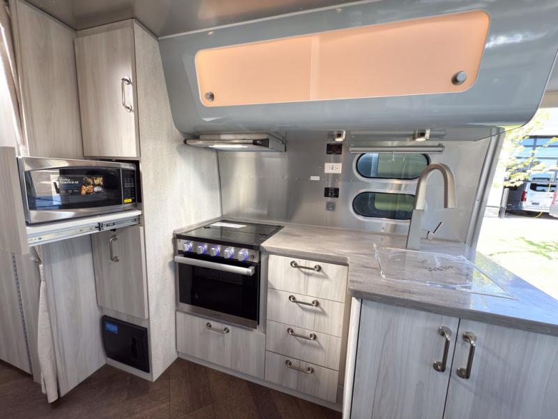 The first thing you will notice about this International travel trailer is the calming atmosphere! Airstream has done a wonderful job of creating a tranquil sanctuary for you to take your vacations in. The kitchen has a three-burner cooktop, stainless steel sink, 8 cu. ft. refrigerator, and microwave so that you can create new and exciting dishes each time you are away. This trailer also has excellent storage space with the overhead storage lockers, the wardrobe with hanging bar, the under-bed storage, and the exterior storage compartment. You can also find great entertainment as you spend your time in this trailer because the two 12V DC Smart TVs will allow you to watch a movie on the Blu-Ray DVD player. Some available options for this model include the optional twin beds in place of the queen bed and the optional rear hatch with a front bunk. If the front bunk option is chosen, it will replace the overhead storage in the bedroom!