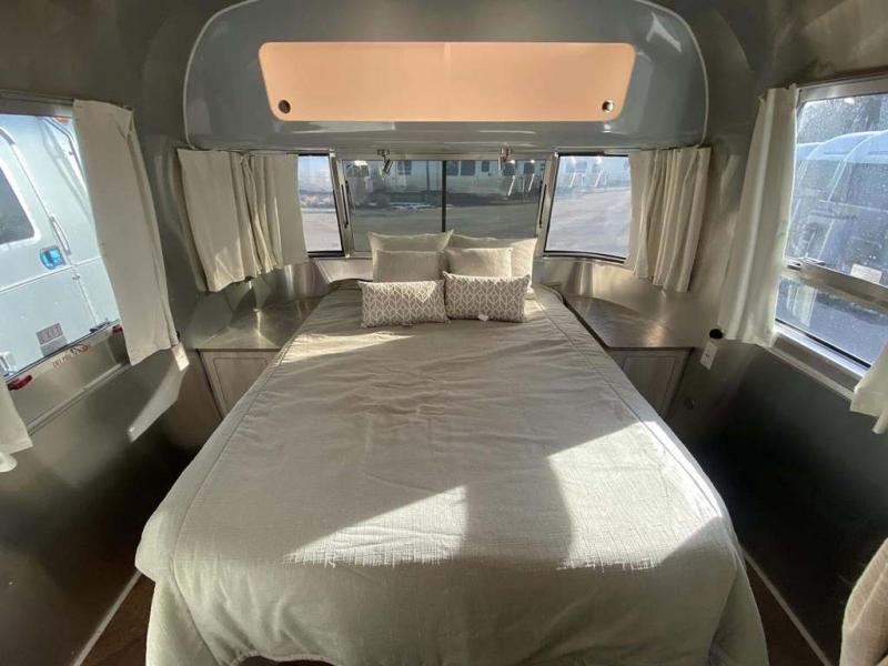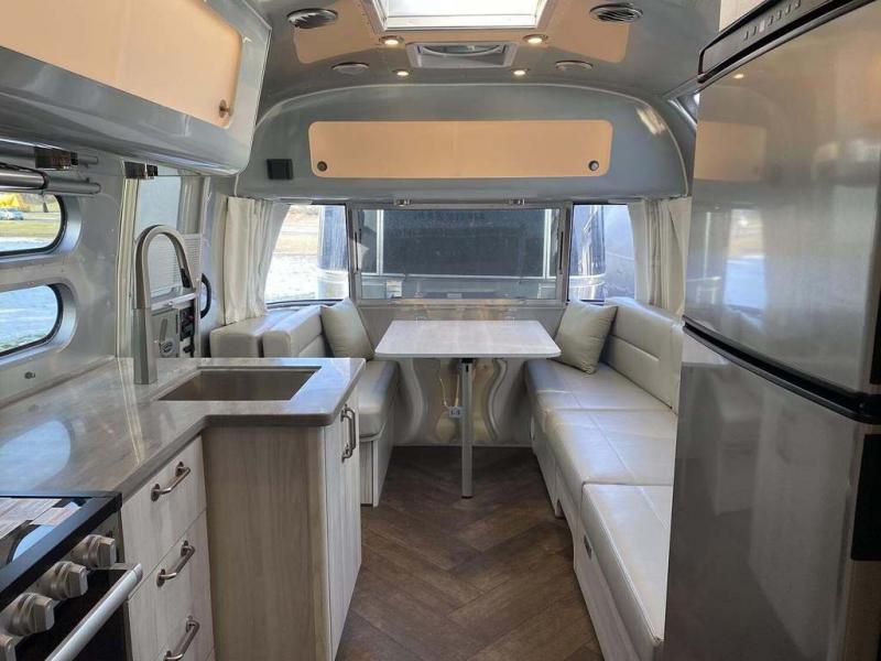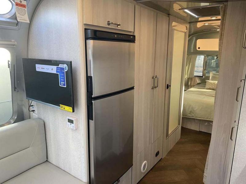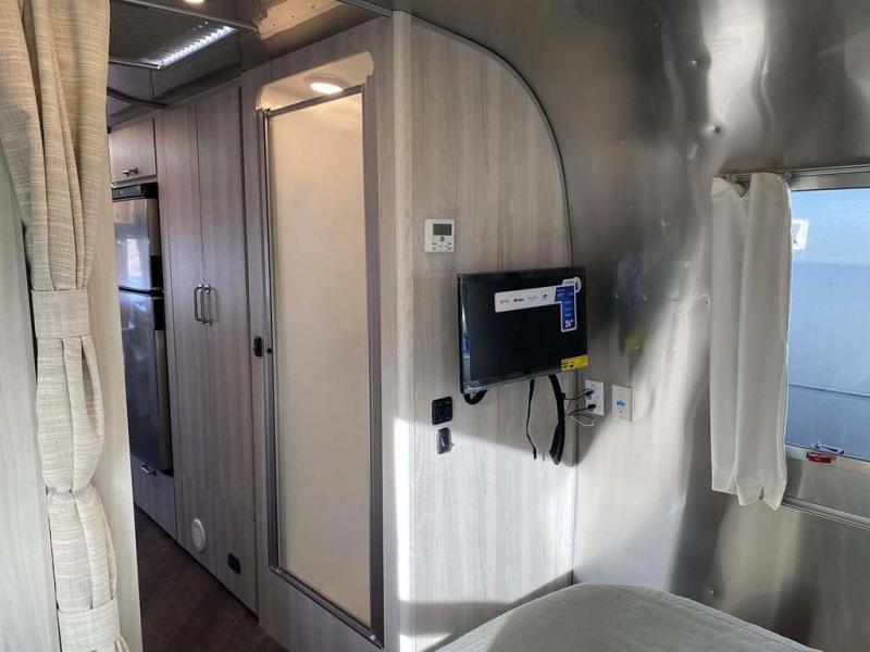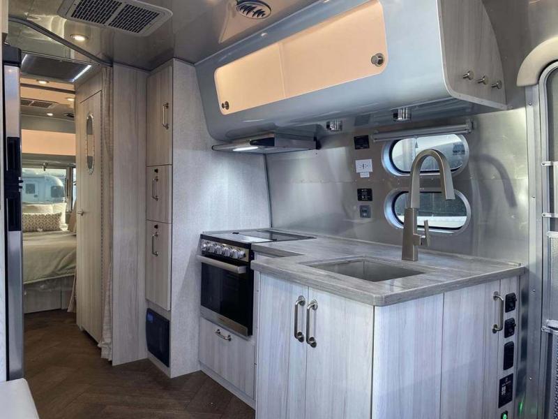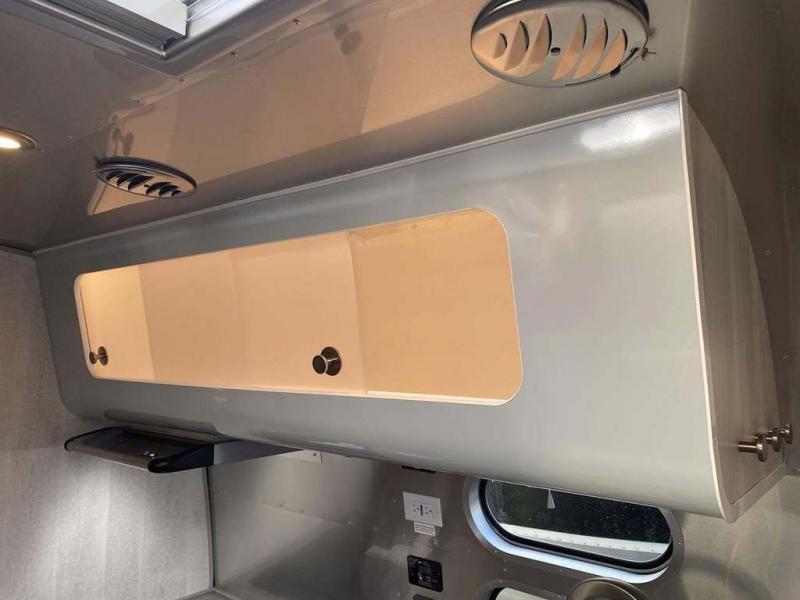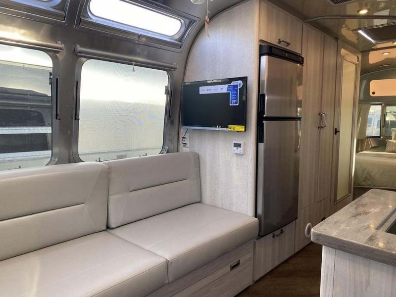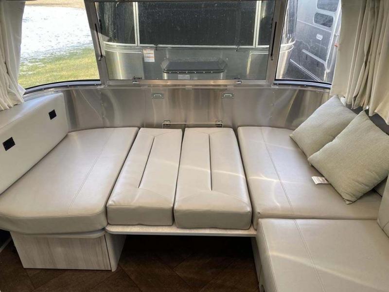 The first thing you will notice about this International travel trailer is the calming atmosphere! Airstream has done a wonderful job of creating a tranquil sanctuary for you to take your vacations in. The kitchen has a three-burner cooktop, stainless steel sink, 8 cu. ft. refrigerator, and microwave so that you can create new and exciting dishes each time you are away. This trailer also has excellent storage space with the overhead storage lockers, the wardrobe with hanging bar, the under-bed storage, and the exterior storage compartment. You can also find great entertainment as you spend your time in this trailer because the two 12V DC Smart TVs will allow you to watch a movie on the Blu-Ray DVD player. Some available options for this model include the optional twin beds in place of the queen bed and the optional rear hatch with a front bunk. If the front bunk option is chosen, it will replace the overhead storage in the bedroom!