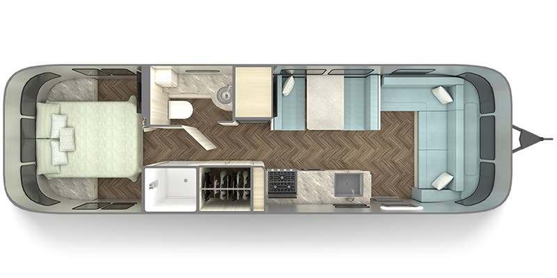 Every time you step foot into the Airstream International travel trailer, you will feel as if you are breathing in a breath of fresh air! The fresh coastal décor was inspired by the waterfront, and the stylish interior delivers a relaxing environment and comfortable luxury. The panoramic windows increase the amount of natural sunlight that streams through to the interior, but they also have blackout shades that you can close whenever you need a darkened room. The beautiful handcrafted marine-grade Lite-Ply laminated cabinetry is an attractive base for the overhead storage lockers that have sliding doors and LED lighting. The dimmable interior LED lighting will create the perfect amount of illumination for you as you spend time indoors. The exterior has excellent features as well with its enclosed aluminum insulated heated underbelly, unique front door key with heavy-duty deadbolt, optional solar package, solar front window protection, and exterior shower with hot and cold water.