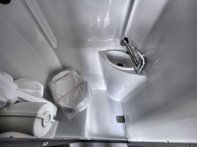Once you arrive at camp, preparing meals is simple thanks to the well-planned galley featuring a two-burner cooktop, convection microwave, stainless steel sink, and slide-out pantry. The rear sofa and side seating convert into a spacious lay-flat bed—one of the largest in its class—comfortably sleeping two. A built-in wet bath adds everyday convenience, allowing you to stay clean and comfortable wherever the road takes you.