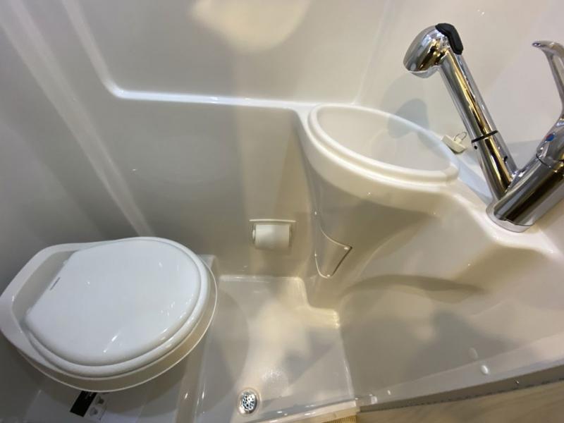 Wet bath with shower, toilet, and sink — European-style efficient design