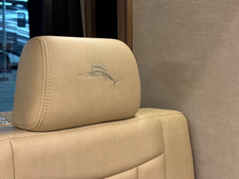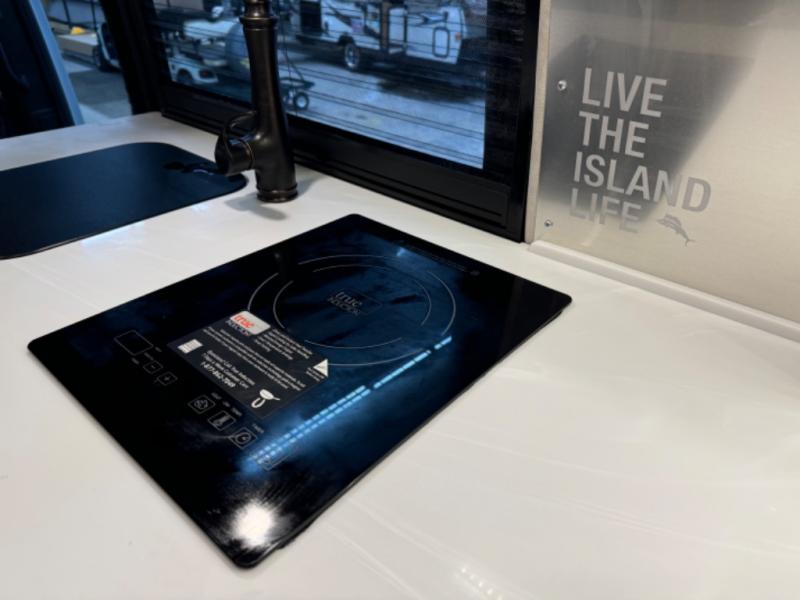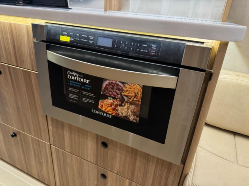 Get ready to drive and stay in comfort and luxury in this motorhome with everything you need and everything you didn't even know you wanted! The heated driver and passenger seats swivel to face the interior living space allowing you to utilize the Corian countertop with an LED TV above to place your beverages, and the driver can use this as a desk to work from here once stopped. Whip up a meal using the galley kitchen featuring a two-burner gas stove, and a large stainless steel sink and faucet, plus extra counter space for food prep. There is a 1.2 cu. ft. drawer microwave and deep drawers for storage, plus a slide-out pantry and a refrigerator with a freezer across from the sink. The power sofa in the rear can be fully flat with a push of a button so two can sleep or rest. And there is storage throughout for your hanging clothes, towels, luggage, dishes and more.