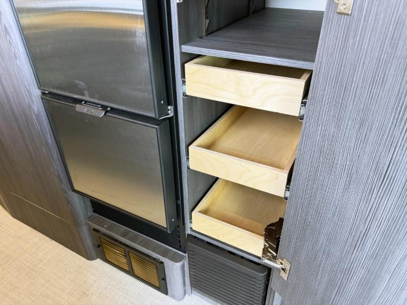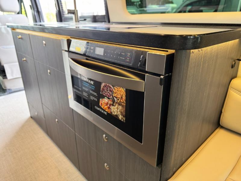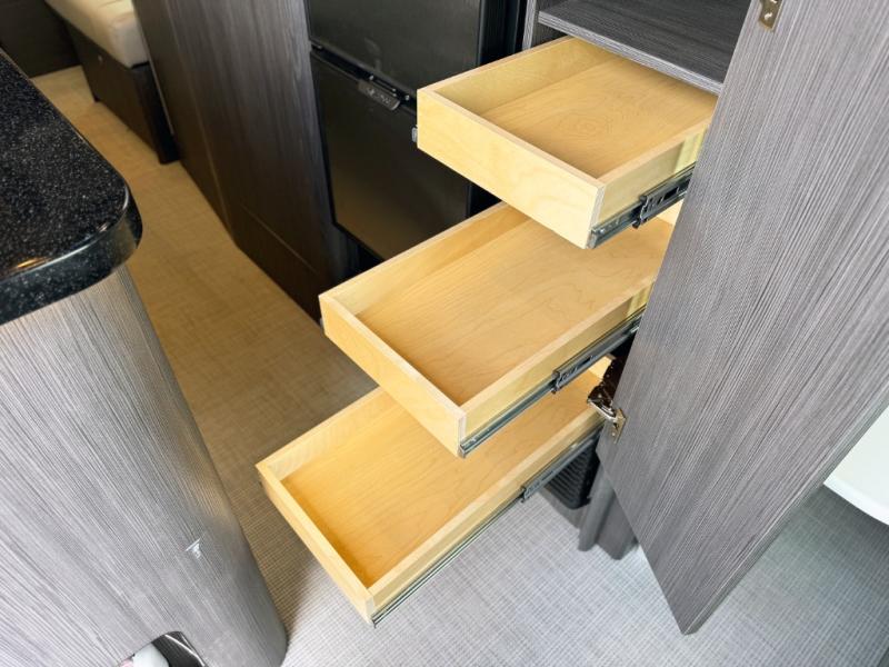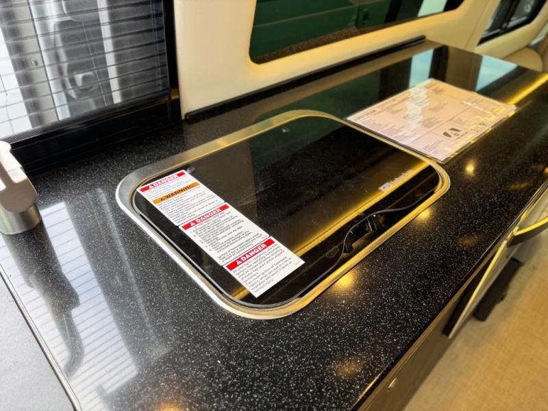 Get ready to drive and stay in comfort and luxury in this motorhome with everything you need and everything you didn't even know you wanted! The heated driver and passenger seats swivel to face the interior living space allowing you to utilize the Corian countertop with an LED TV above to place your beverages, and the driver can use this as a desk to work from here once stopped. Whip up a meal using the galley kitchen featuring a two-burner gas stove, and a large stainless steel sink and faucet, plus extra counter space for food prep. There is a 1.2 cu. ft. drawer microwave and deep drawers for storage, plus a slide-out pantry and a refrigerator with a freezer across from the sink. The power sofa in the rear can be fully flat with a push of a button so two can sleep or rest. And there is storage throughout for your hanging clothes, towels, luggage, dishes and more.