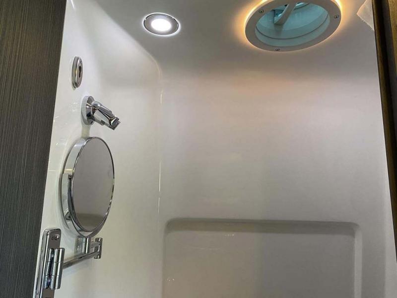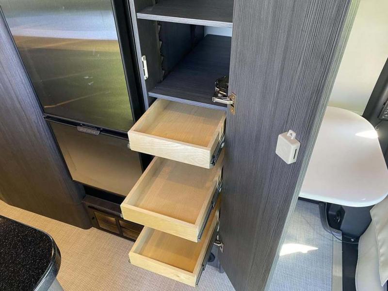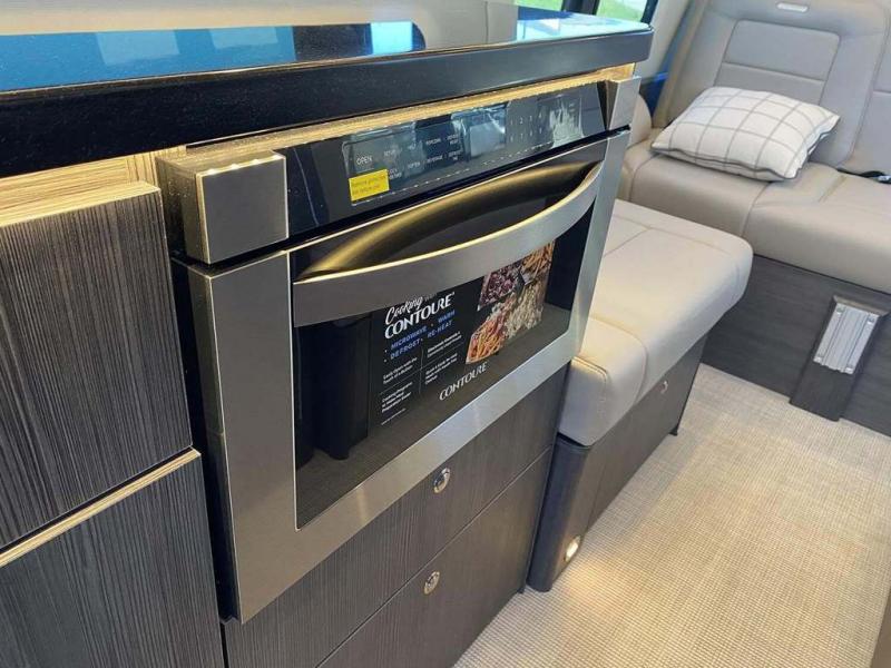 Get ready to drive and stay in comfort and luxury in this motorhome with everything you need and everything you didn't even know you wanted! The heated driver and passenger seats swivel to face the interior living space allowing you to utilize the Corian countertop with an LED TV above to place your beverages, and the driver can use this as a desk to work from here once stopped. Whip up a meal using the galley kitchen featuring a two-burner gas stove, and a large stainless steel sink and faucet, plus extra counter space for food prep. There is a 1.2 cu. ft. drawer microwave and deep drawers for storage, plus a slide-out pantry and a refrigerator with a freezer across from the sink. The power sofa in the rear can be fully flat with a push of a button so two can sleep or rest. And there is storage throughout for your hanging clothes, towels, luggage, dishes and more.