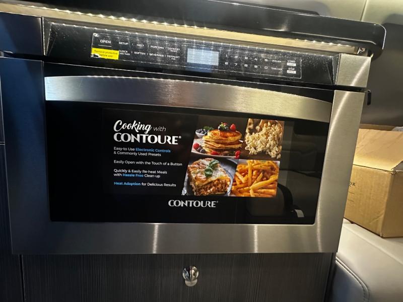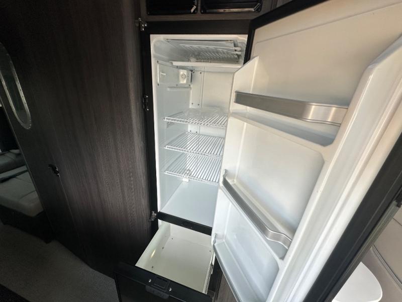 Get ready to drive and stay in comfort and luxury in this motorhome with everything you need and everything you didn't even know you wanted! The heated driver and passenger seats swivel to face the interior living space allowing you to utilize the Corian countertop with an LED TV above to place your beverages, and the driver can use this as a desk to work from here once stopped. Whip up a meal using the galley kitchen featuring a two-burner gas stove, and a large stainless steel sink and faucet, plus extra counter space for food prep. There is a 1.2 cu. ft. drawer microwave and deep drawers for storage, plus a slide-out pantry and a refrigerator with a freezer across from the sink. The power sofa in the rear can be fully flat with a push of a button so two can sleep or rest. And there is storage throughout for your hanging clothes, towels, luggage, dishes and more.