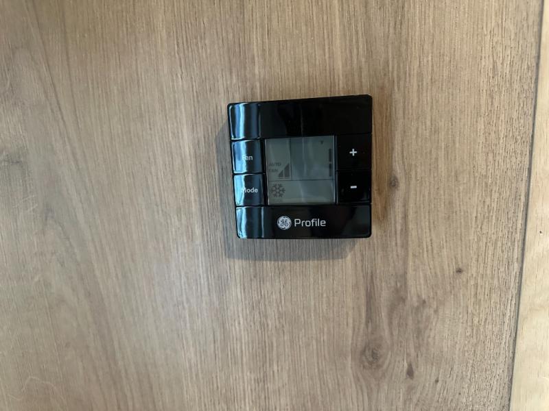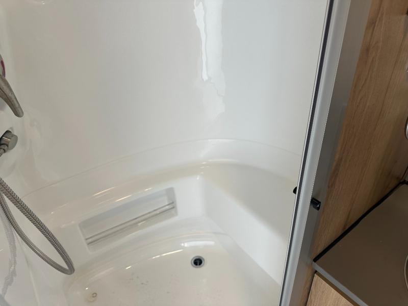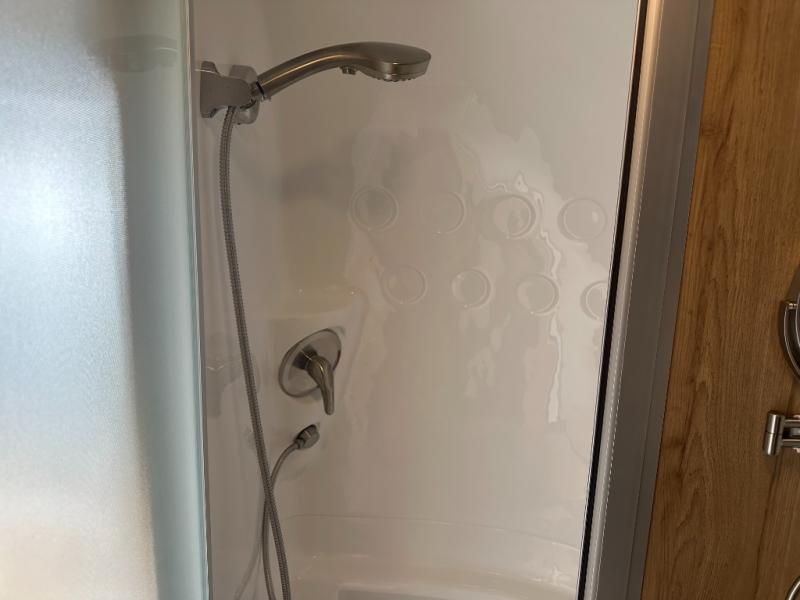 At the rear, a full bathroom includes upscale touches like a reeded glass shower door, removable handheld shower head, and retractable clothesline—perfect for airing out towels, swimsuits, or your hiking gear.