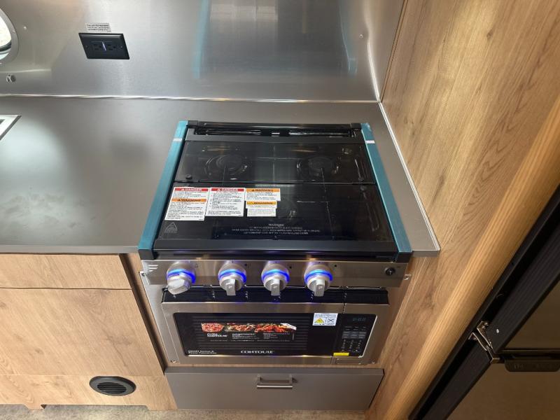 The 23FBT layout combines a spacious feel with smart separation of living zones. Up front, you’ll find twin beds, a Smart TV, and panoramic windows that wrap you in scenic views. The center lounge and kitchen feature a versatile U-shaped dinette that easily converts into extra sleeping space. Cook like you never left home with a three-burner stove, oven, and 12V refrigerator—or upgrade to the optional convection microwave for even more flexibility.