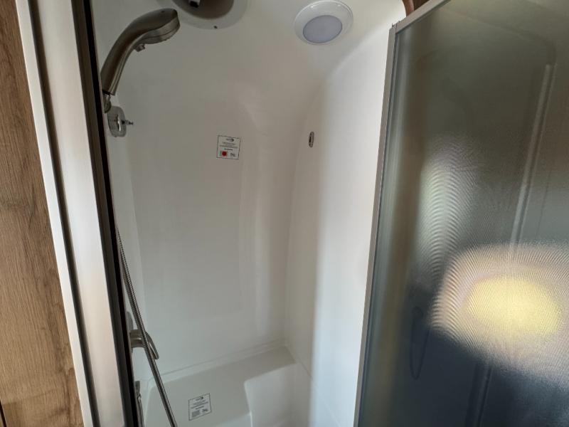 Trade your briefcase for luggage and head for the hills in this travel trailer for five! When you arrive at your destination, you can set up the ZipDee manual patio awning with LED lights, grab the camp chairs from the storage, and relax with a cold drink. There is a private toilet and vanity in a half bath, with the independent shower across the hall so two people can freshen up at once. You'll find plenty of storage throughout this model, including a closet to keep clothes wrinkle-free, underbed storage, plus upper and lower cabinets. The kitchen includes high-end appliances, including a 12V refrigerator, and a three burner stove and oven, or you can choose the optional convection microwave. Your crew can gather at the L-shaped dinette with panoramic views provided by the windows, and your guests can sleep here at night. The optional rear hatch can be added for even more convenience, as well as optional twin beds in place of the queen bed if you choose.