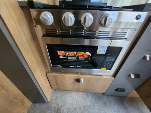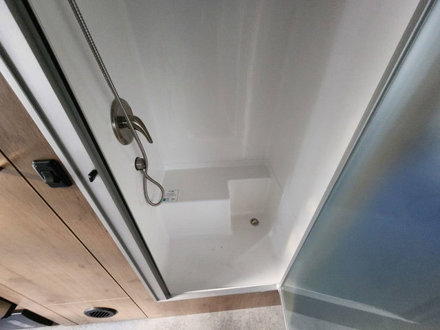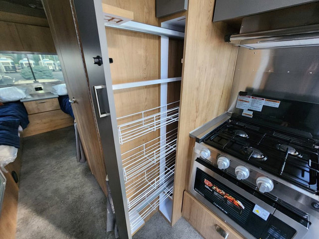 Trade your briefcase for luggage and head for the hills in this travel trailer for five! When you arrive at your destination, you can set up the ZipDee manual patio awning with LED lights, grab the camp chairs from the storage, and relax with a cold drink. There is a private toilet and vanity in a half bath, with the independent shower across the hall so two people can freshen up at once. You'll find plenty of storage throughout this model, including a closet to keep clothes wrinkle-free, underbed storage, plus upper and lower cabinets. The kitchen includes high-end appliances, including a 12V refrigerator, and a three burner stove and oven, or you can choose the optional convection microwave. Your crew can gather at the L-shaped dinette with panoramic views provided by the windows, and your guests can sleep here at night. The optional rear hatch can be added for even more convenience, as well as optional twin beds in place of the queen bed if you choose.