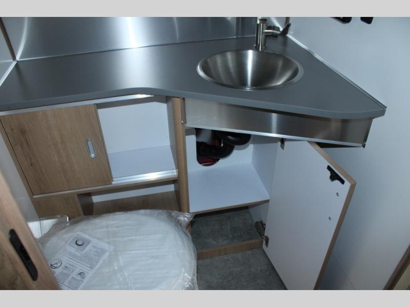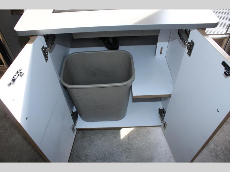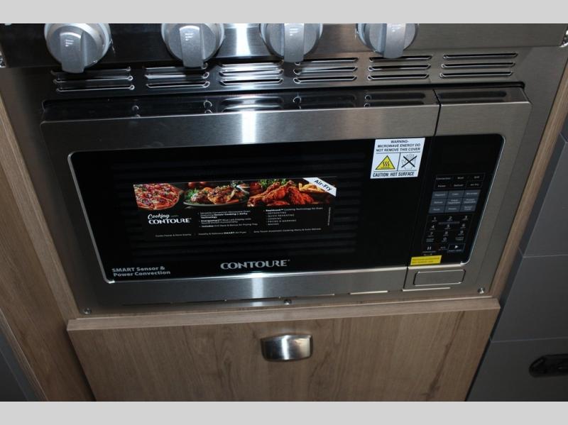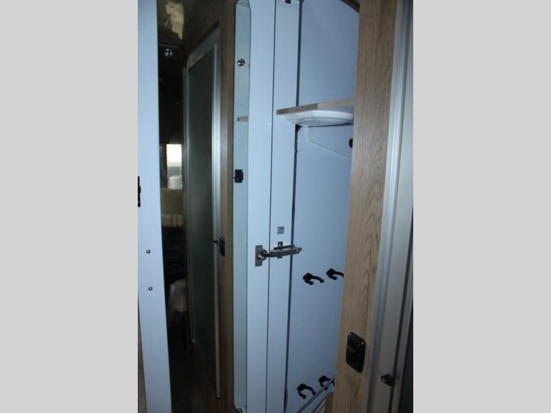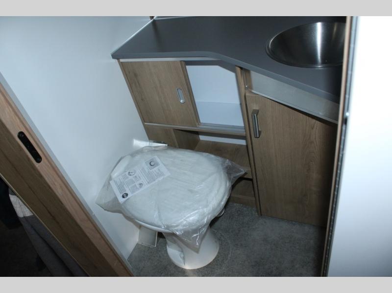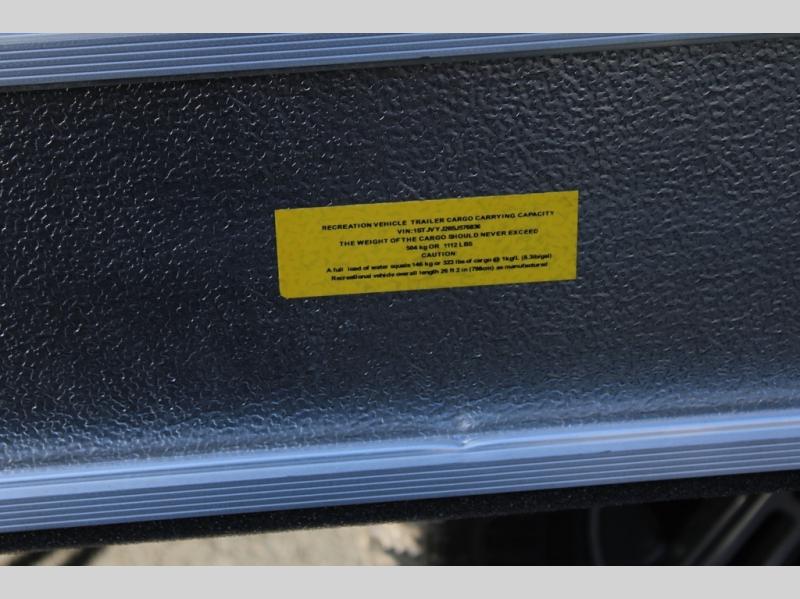 Trade your briefcase for luggage and head for the hills in this travel trailer for five! When you arrive at your destination, you can set up the ZipDee manual patio awning with LED lights, grab the camp chairs from the storage, and relax with a cold drink. There is a private toilet and vanity in a half bath, with the independent shower across the hall so two people can freshen up at once. You'll find plenty of storage throughout this model, including a closet to keep clothes wrinkle-free, underbed storage, plus upper and lower cabinets. The kitchen includes high-end appliances, including a 12V refrigerator, and a three burner stove and oven, or you can choose the optional convection microwave. Your crew can gather at the L-shaped dinette with panoramic views provided by the windows, and your guests can sleep here at night, while you take the front twin beds.