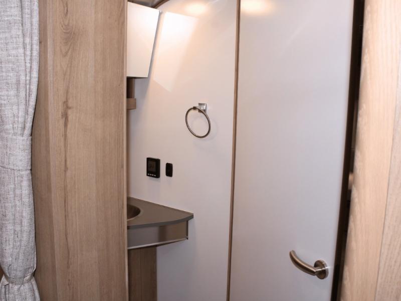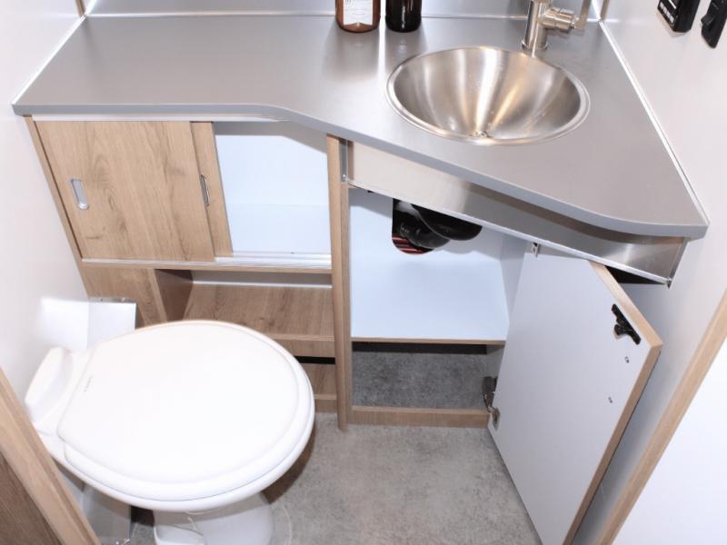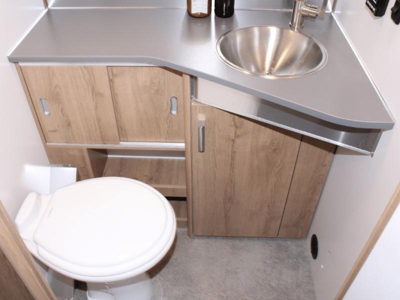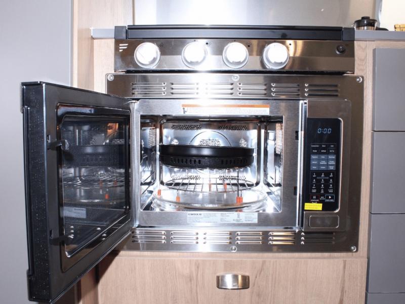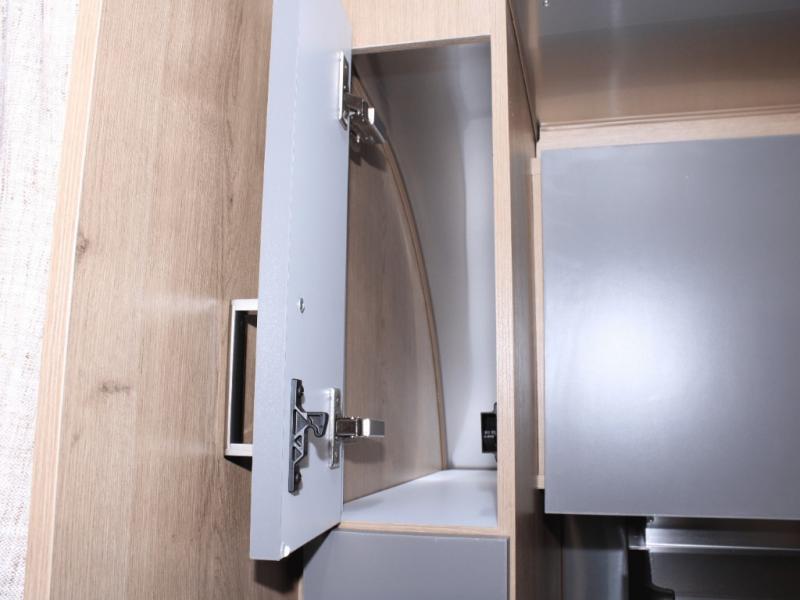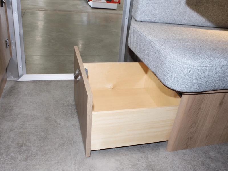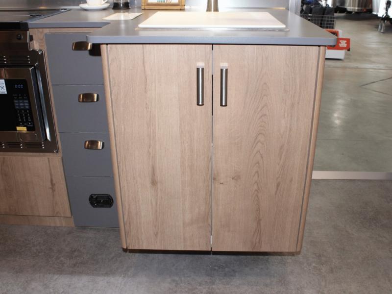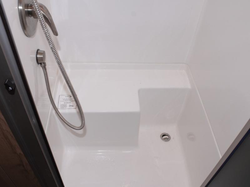 The thoughtfully designed interior features a private half bath with a toilet and vanity, while the separate shower across the hall allows two people to freshen up simultaneously. You’ll find ample storage with a spacious closet to keep clothes wrinkle-free, under-bed compartments, and both upper and lower cabinetry. The modern kitchen is equipped with premium appliances including a 12V refrigerator, a three-burner stove with oven, and an optional convection microwave upgrade. The L-shaped dinette offers panoramic window views and easily converts into additional sleeping space. For added versatility, you can opt for twin beds instead of the queen bed or add a rear hatch for extra airflow and convenience.