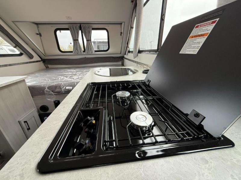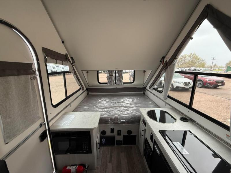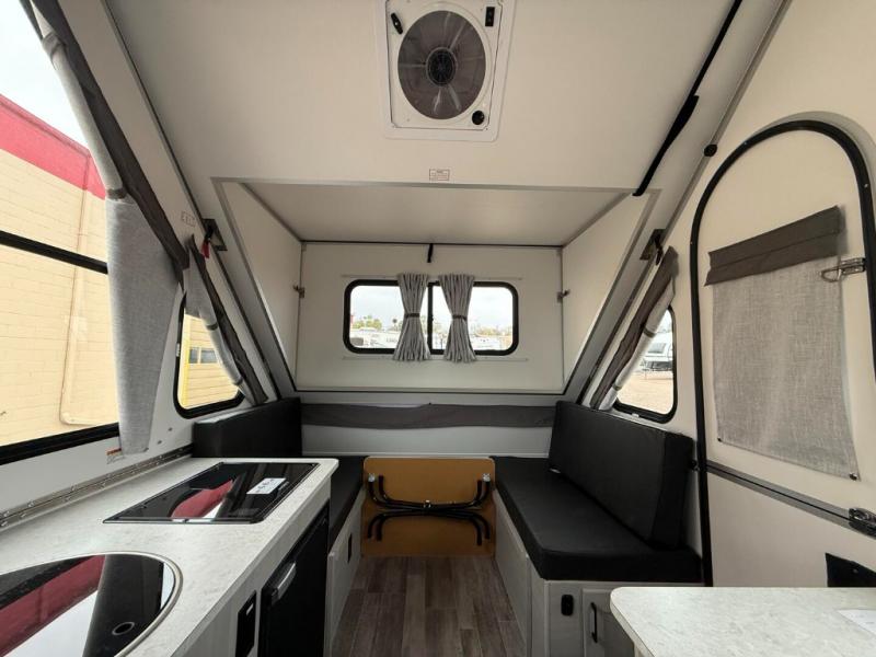 Pack your bags and be on the road in no-time with this lightweight A-frame camper that can sleep three people. You'll enjoy having a front booth dinette and a rear bed/mattress for comfortable dining and sleeping space. Whip up a hearty lunch on the two burner stove, or use the convenient microwave oven. There is also a 3.1 cu. ft. 12V refrigerator for perishables and additional storage space for dry goods.