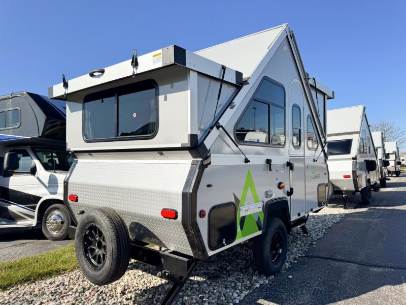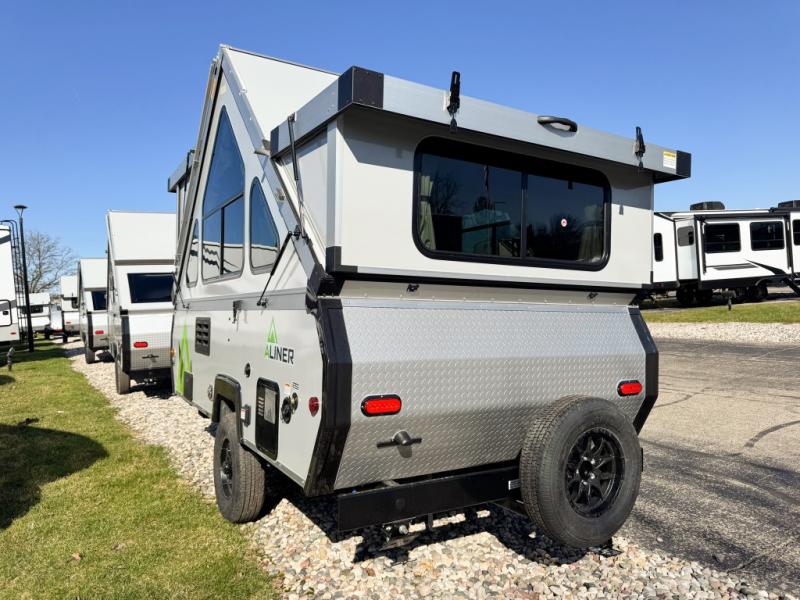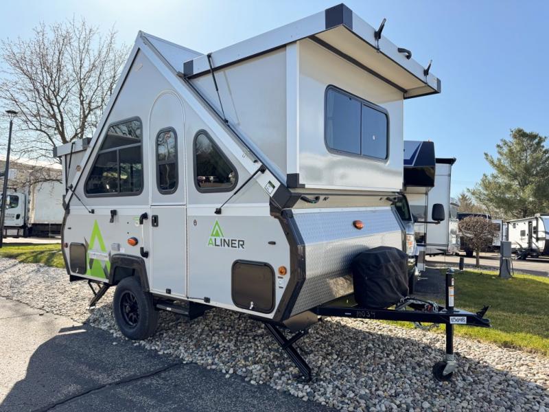 With any Aliner Classic A-frame folding pop-up camper you will find Azdel lightweight, composite interior wall and ceiling panels for added durability and strength. The additional corner windows provide panoramic views, and the hardwood cabinet doors will give these campers a more at-home feel. Four stabilizer jacks come standard, along with an LP connection, an exterior outlet, and an outside shower. It's no wonder these campers are named classic! Choose your model and start camping today!