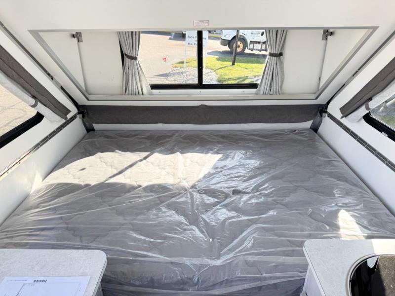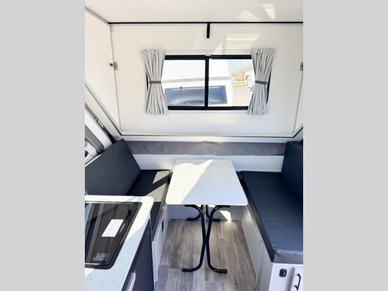 Pack your bags and be on the road in no-time with this lightweight A-frame camper that can sleep three people. You'll enjoy having a front booth dinette and a rear bed/mattress for comfortable dining and sleeping space. Whip up a hearty lunch on the two burner stove, or use the convenient microwave oven. There is also a 3.1 cu. ft. 12V refrigerator for perishables and additional storage space for dry goods.