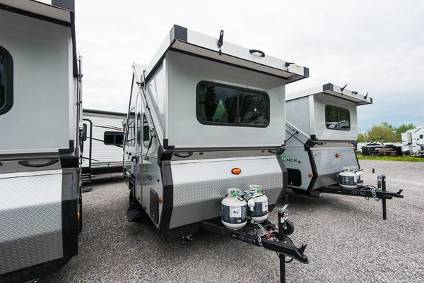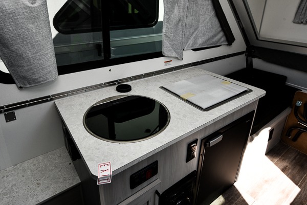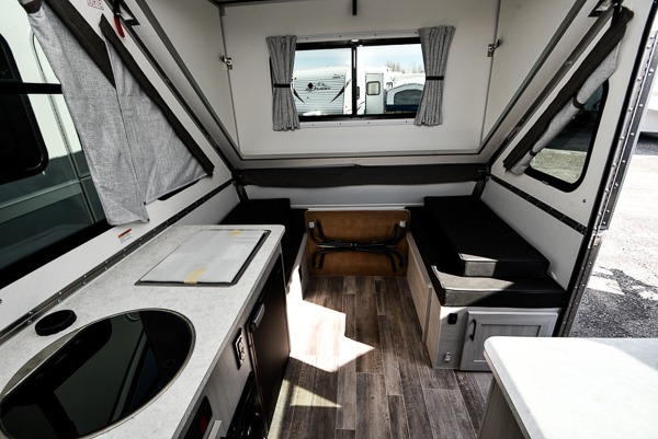 Camping has never been easier than in this A-frame camper. Once you arrive at your destination, grab your gear from the two exterior baggage doors, then head inside to make lunch on the two-burner stove top. The sofa bed can convert to a 60" x 76" bed, and the dinette converts to a 46" x 76" bed for comfortable sleeping space at night. You will also enjoy LED interior lights and electrical outlets to keep you charged up, and there is plenty of storage for your camp gear.