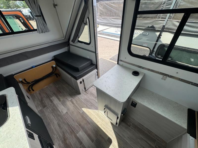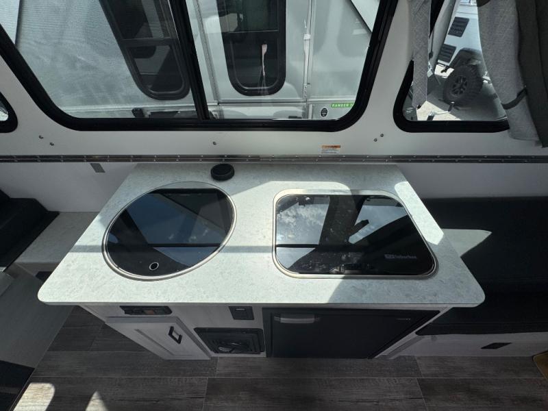 Camping has never been easier than in this A-frame camper. Once you arrive at your destination, grab your gear from the two exterior baggage doors, then head inside to make lunch on the two burner stove top. The sofa bed can convert to a 60" x 76" bed, and the dinette converts to a 46" x 76" bed for comfortable sleeping space at night. You will also enjoy LED interior lights and electrical outlets to keep you charged up, and there is plenty of storage for your camp gear.
