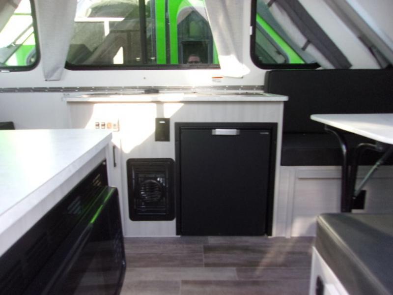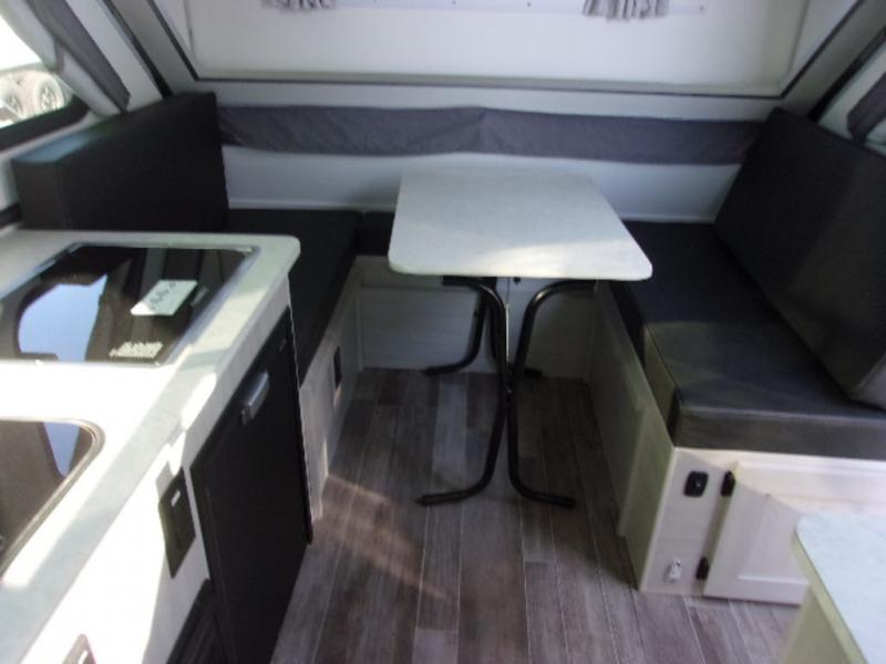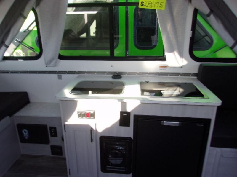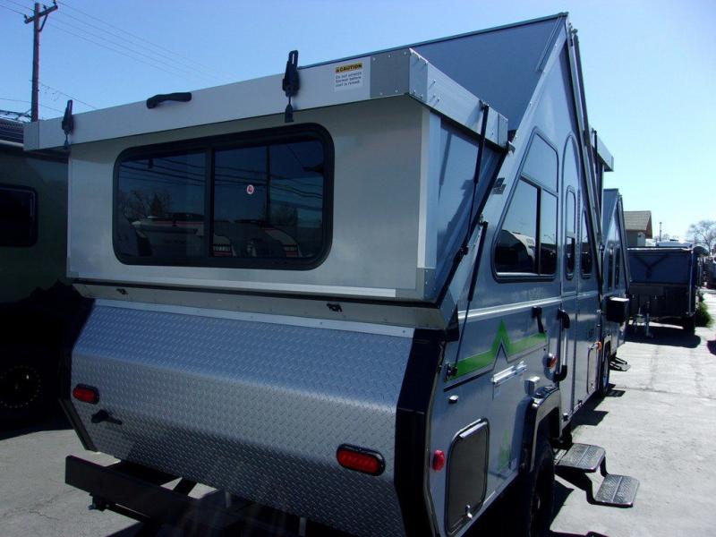 Camping has never been easier than in this A-frame camper. Once you arrive at your destination, grab your gear from the two exterior baggage doors, then head inside to make lunch on the two-burner stove top. The sofa bed can convert to a 60" x 76" bed, and the dinette converts to a 46" x 76" bed for comfortable sleeping space at night. You will also enjoy LED interior lights and electrical outlets to keep you charged up, and there is plenty of storage for your camp gear.