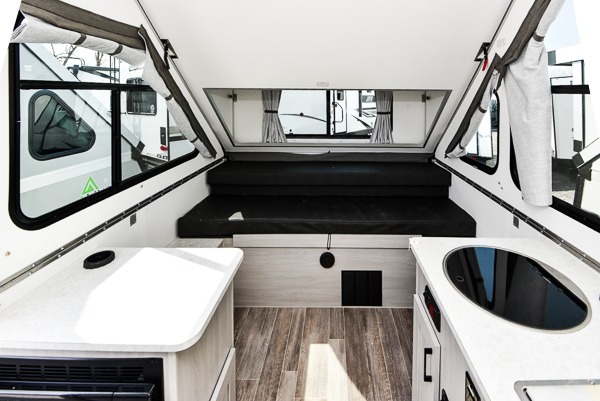 Camping has never been easier than in this A-frame camper. Once you arrive at your destination, grab your gear from the two exterior baggage doors, then head inside to make lunch on the two burner in/out stove. The sofa bed can convert to a 60" x 76" bed, and the dinette converts to a 46" x 76" bed for comfortable sleeping space at night. You will find under-dinette storage for your belongings, plus two shelves on either side of the sofa bed.