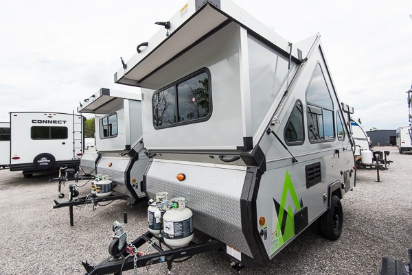 With any Aliner Classic A-frame folding pop-up camper you will find Azdel lightweight, composite interior wall and ceiling panels for added durability and strength. The additional corner windows provide panoramic views, and the hardwood cabinet doors will give these campers a more at-home feel. Four stabilizer jacks come standard, along with dual propane tanks, an exterior outlet, and an outside shower. It's no wonder these campers are named classic! Choose your model and start camping today!