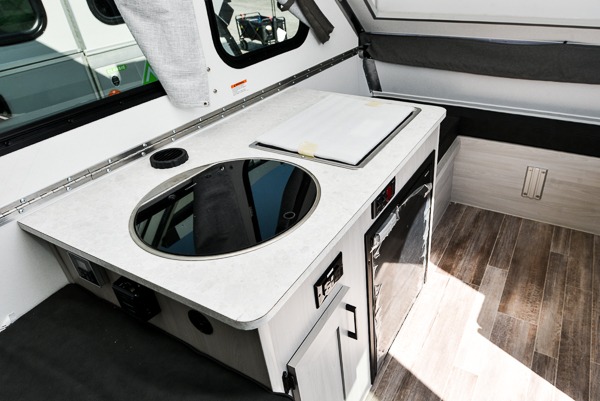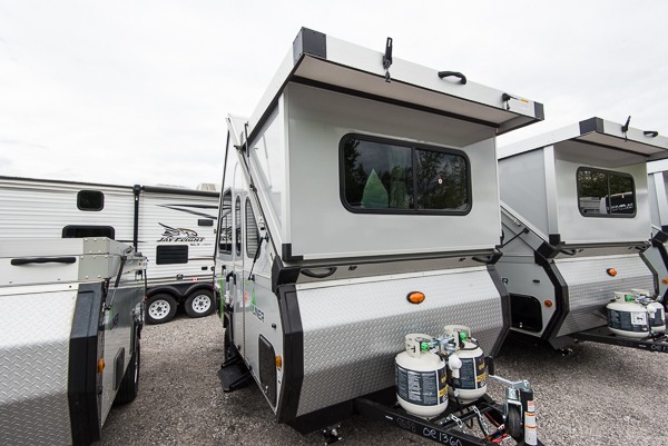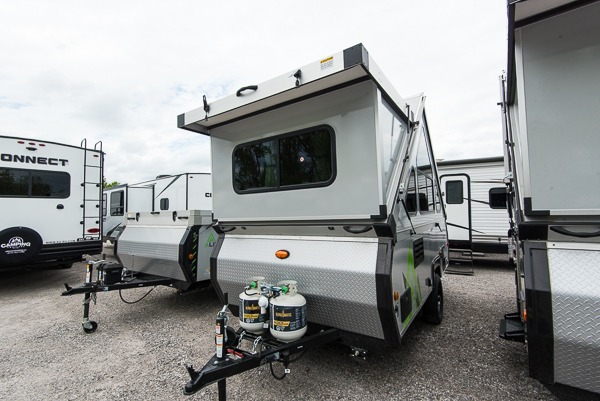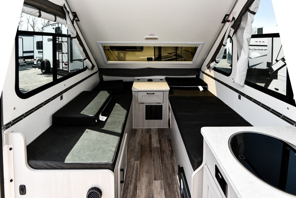 Camping has never been easier than in this A-frame camper. Once you arrive at your destination, grab your gear from the two exterior baggage doors, then head inside to make lunch on the two burner in/out stove. The sofa bed can convert to a 60" x 76" bed, and the dinette converts to a 46" x 76" bed for comfortable sleeping space at night. You will find under-dinette storage for your belongings, plus two shelves on either side of the sofa bed.