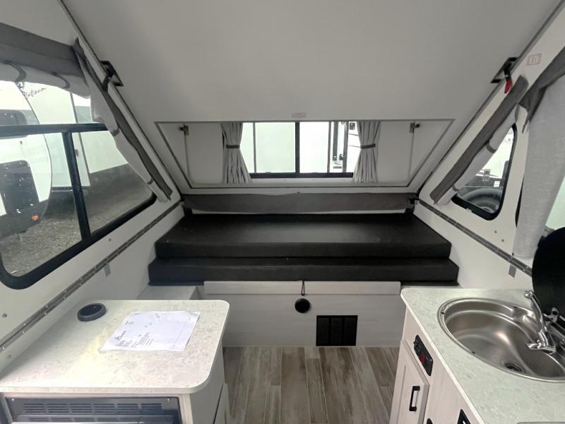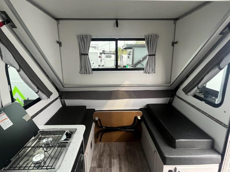 If you enjoy camping with friends or you need your own space at night, this Twin Bed model will do the trick! While two campers take the rear twin beds, the front booth dinette can convert to a 30" x 76" bed for an extra guest, and in the morning, you can convert it back to dining space. Whip up breakfast on the two-burner stove or use the convenient microwave oven. There is also a sink to clean up your dishes plus a 3.1 cu. ft. 12V refrigerator to put milk and eggs back in. Don't let this cute A-Frame slip away!