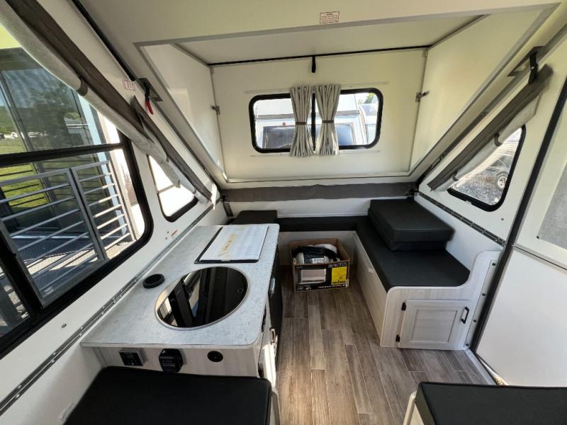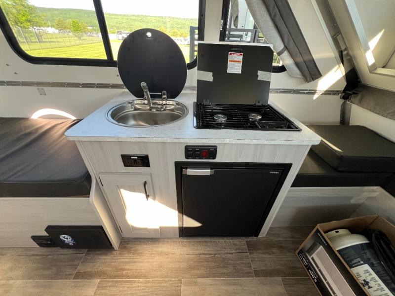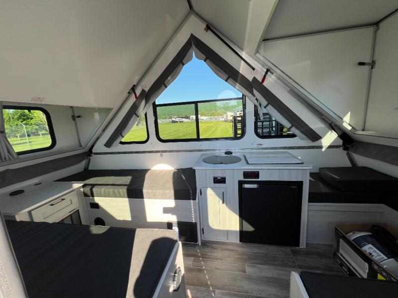 If you enjoy camping with friends or you need your own space at night, this Twin Bed model will do the trick! While two campers take the rear twin beds, the front booth dinette can convert to a 30" x 76" bed for an extra guest, and in the morning you can convert it back to dining space. Whip up breakfast on the two burner stove, or use the convenient microwave oven. There is also a sink to clean up your dishes plus a 3.1 cu. ft. 12V refrigerator to put milk and eggs back in. Don't let this cute A-Frame slip away!
