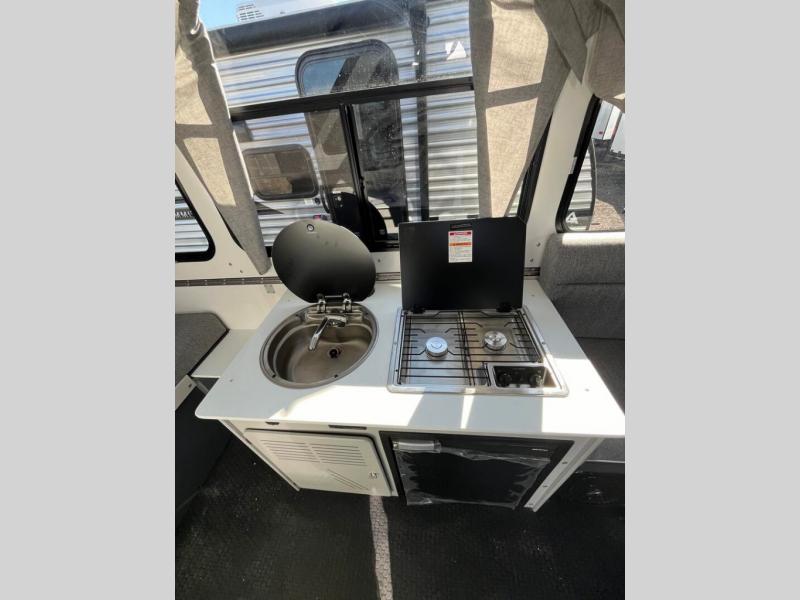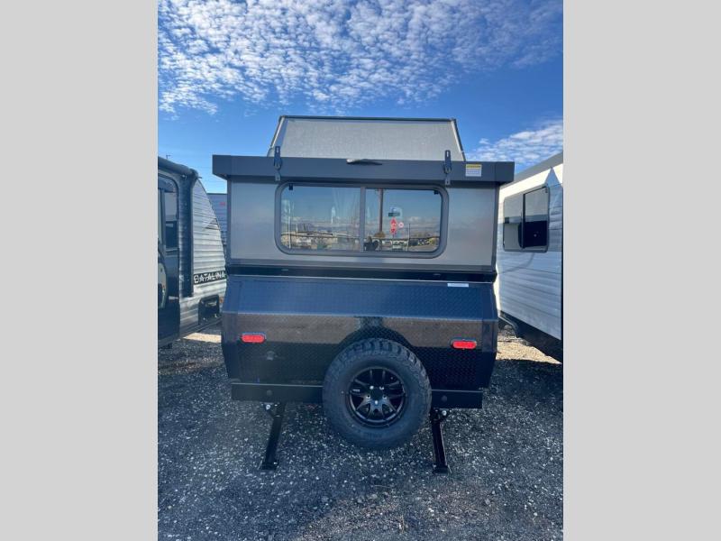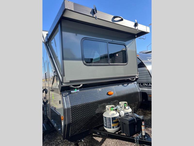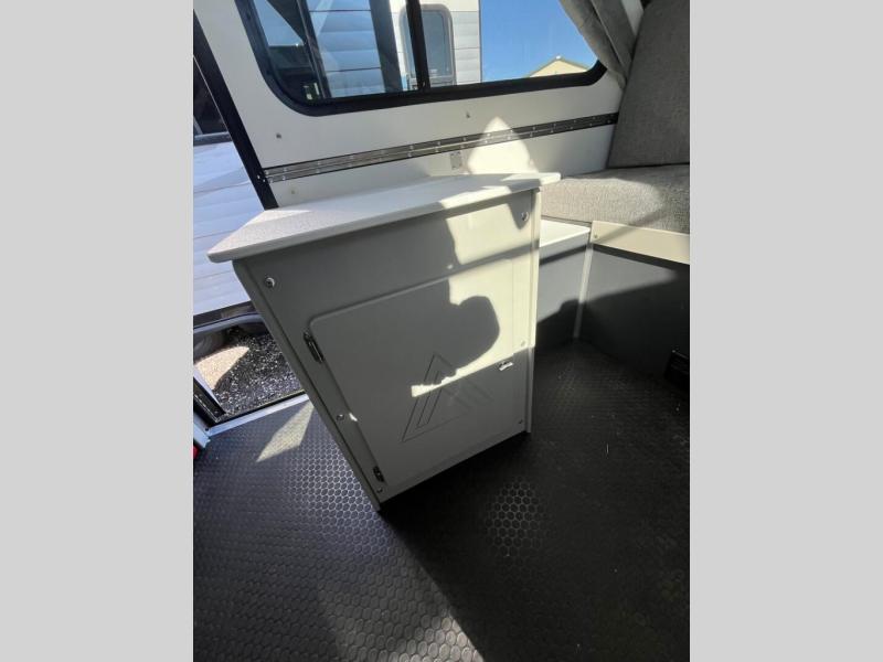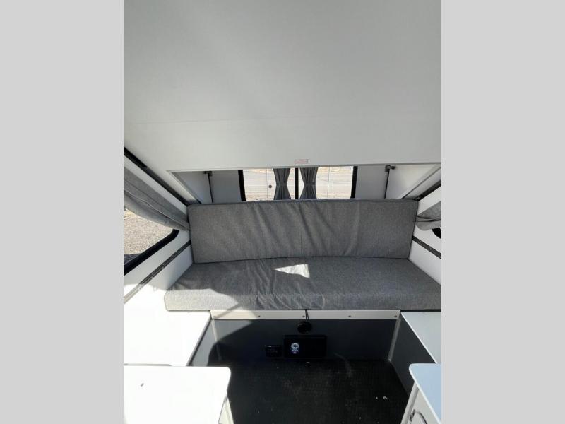The Evolution A-frame camper by Aliner is coming to you with residential features and solid construction materials. You'll love the slate gray exterior, and the Azdel composite panels included help prolong the life of your camper. There are 15" off-road tires with graphics package, LED running lights, exterior baggage doors, plus many more exterior conveniences. The Evolution A-Frame camper comes with commercial grade, raised coin polyvinyl flooring, SIMONA BOATBOARD interior cabinets and furniture, and three indoor electrical outlets to name a few interior comforts.